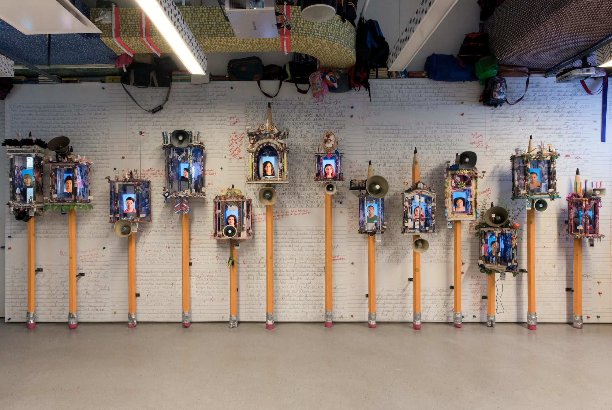 "Badge of Honor" (1995), one of many works by Puerto Rican artist Pepón Osorio included in this much-deserved survey, is the kind of art that stays with you forever. Osorio, known for his theatrically staged environments that recreate public and private spaces to tell lesser-known stories, filmed a dialogue between an incarcerated father and his son by traveling back and forth between a New Jersey prison and the child’s home. The footage is projected on the walls of two adjacent spaces: One is the child’s bedroom, plastered in baseball cards and posters and other memorabilia of teenage joy; the other is a starkly empty jail cell. Like so many of Osorio’s installations, this one proves that socially engaged art can help us feel the impact of oppressive systems, such as mass incarceration, in ways other works can’t. —VD