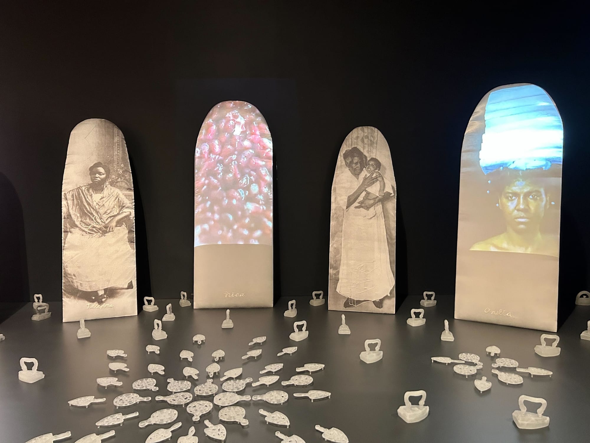 Upon entering María Magdalena Campos-Pons’s exhibition, visitors are greeted by “Spoken Softly With Mama” (1998), an installation of upright ironing boards printed with family photographs onto which are projected videos of the artist’s bare legs walking and hands peeling a pomegranate. The boards stand on a raised platform, scattered with cast-glass irons and trivets, that lends the work the gravitas of an elegy with the intimate softness of a nursery rhyme. It sets the mood for the rest of the show, in which the artist draws from her own roots and core values — her Afro-Cuban ancestry, her upbringing on a former sugar plantation, and the role of mothers and women, to name a few — to establish a profound connection with the viewer. Through her photographs, sculptures, paintings, and more, Campos-Pons holds our gaze. —VD