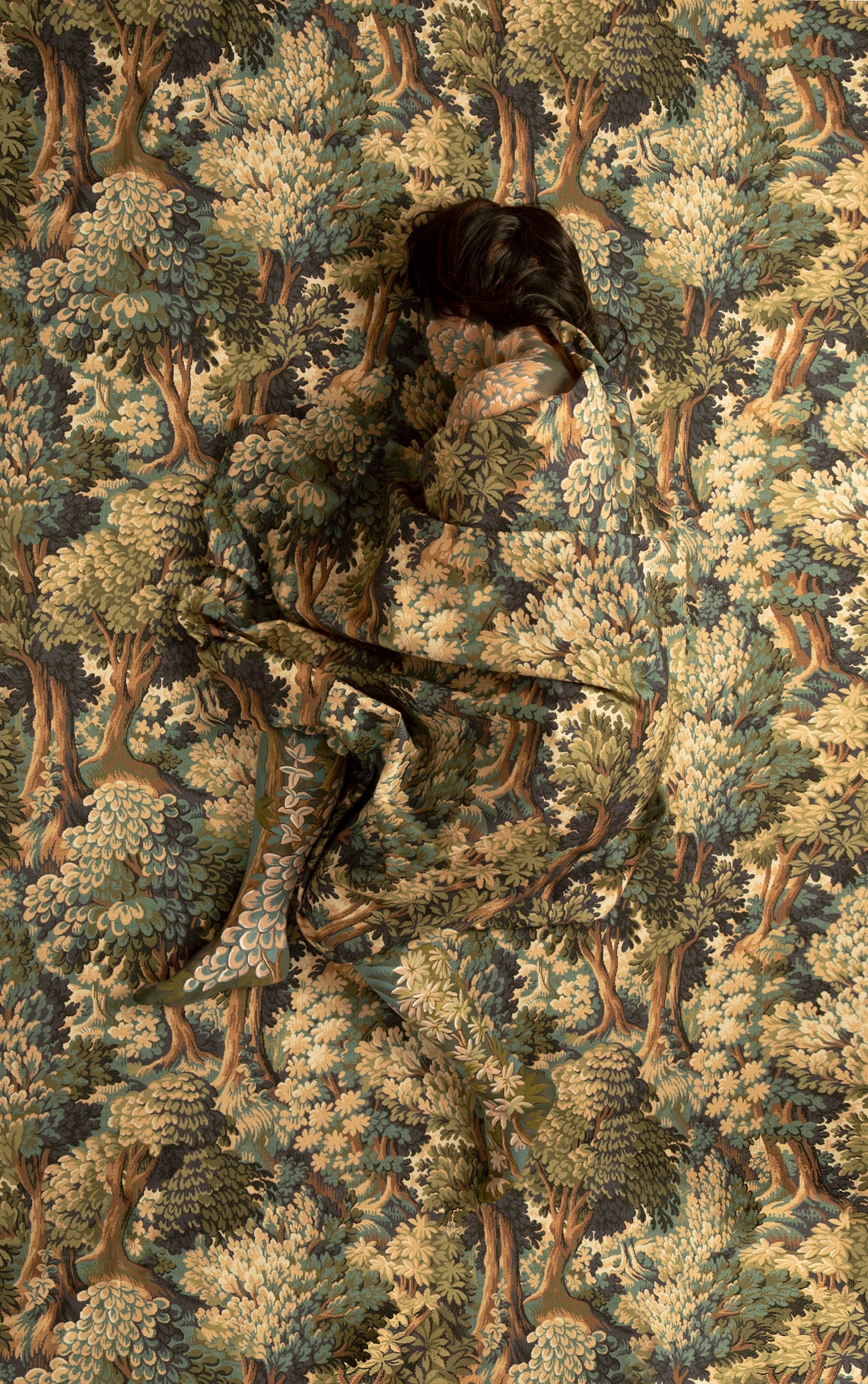 Cecilia Paredes refers to her works as “photo performances,” an apt term for the way in which she does not just create photographs but rather becomes them. The Peruvian-born, Philadelphia-based artist paints her skin and clothing to camouflage her body against intricate fabrics printed with floral and foliage patterns. In the most striking compositions, like “Tapisserie” (2023), Paredes plays with alternately concealing and revealing elements of the picture such that the contours of her figure appear three dimensional and sculptural. The images are as illusive and attractive as the eyes of a butterfly. —VD
