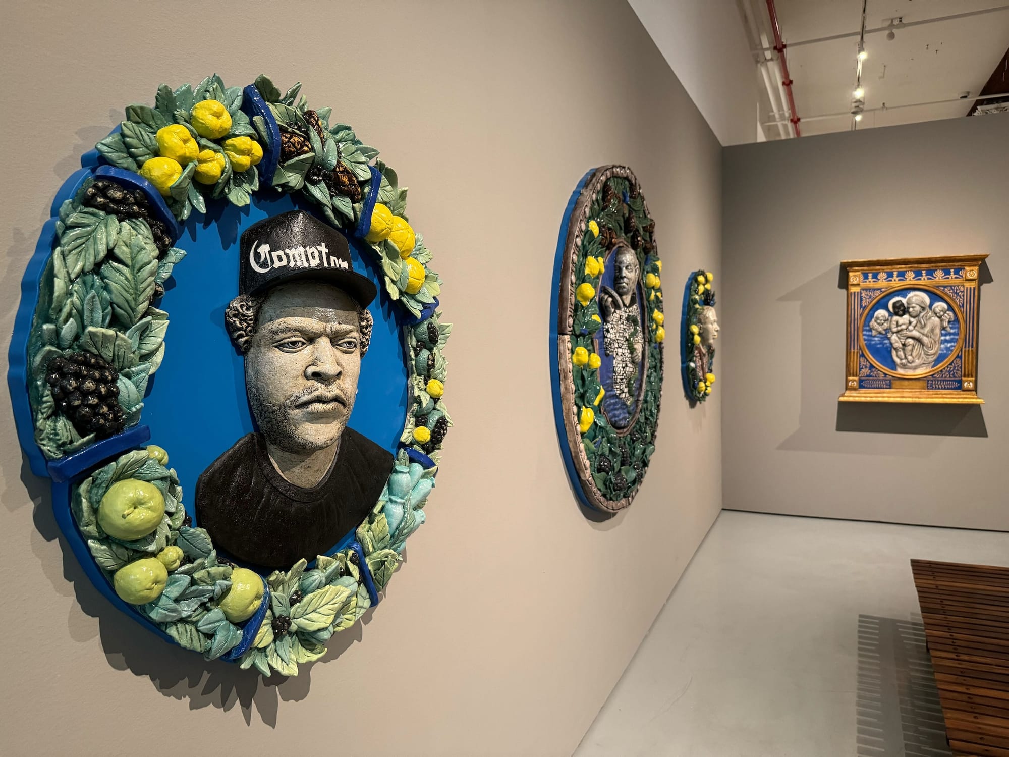 Roberto Lugo’s ceramic work blends historical European art history with contemporary American life effortlessly, creating visually playful objects that solicit a smile but also awe you with their technical prowess. He has recreated Whistler’s famous Peacock Room using pigeons, calling it “The Pigeon Crib.” And then in the back he has a whole series of black and red pottery that is infused with contemporary scenes from city life. The true tour de force is his large Della Robske series, riffing off Renaissance sculptor Luca Della Robbia’s polychrome ceramic roundels. These are instant stunners. A highly recommended exhibition. —HV