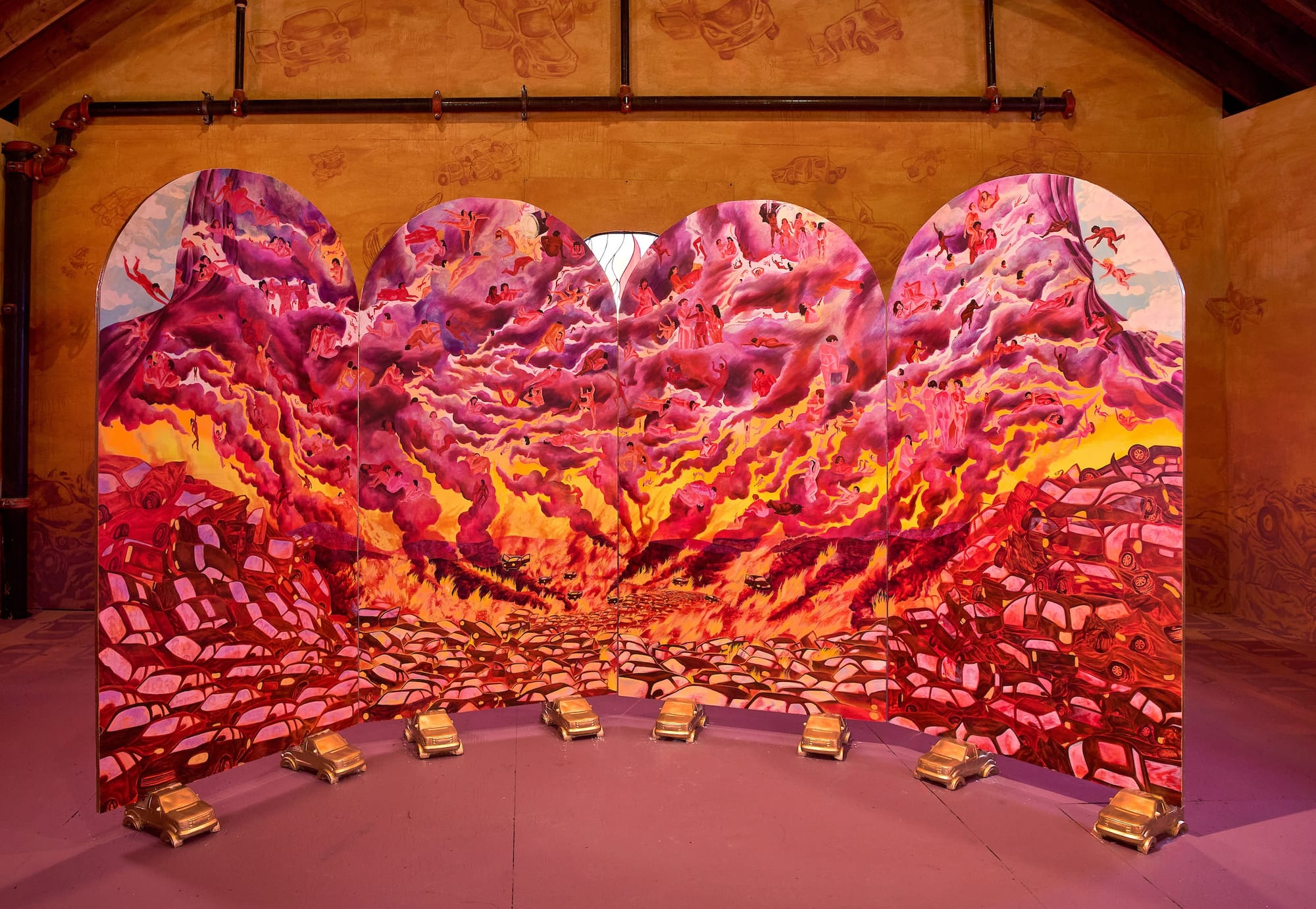 The dynamic creative scene at Wassaic Project is always in full swing, and this summer’s group exhibition So It Goes embodies its fun-loving intensity. Installations, paintings, ceramics, and artworks that defy categorization by 43 artists working across disciplines, such as Caleb Weintraub’s “Mincing Words” (2024) and the vision of two figures cavorting amid a colorful quasi-Surrealist fruit-infused blow-out, respond to the title of this show and the legacy of Kurt Vonnegut’s Slaughterhouse-Five (1969) with artistic embodiments meant to shake us from our desensitization to horror.