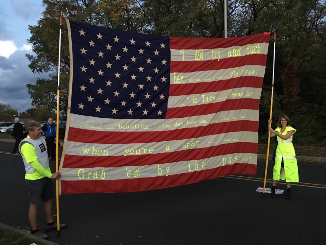 In November, the Red-Dot Art Fair in Miami decided to remove the work of leftist art collective, t.Rutt, who spent much of 2016 following the Donald Trump campaign in a repurposed tour bus of the President-elect. Part of what irked organizers was a large flag included in the work, which T. Rutt embroidered with Trump’s comments from the leaked Access Hollywood tape. In response, Eric Smith, president and CEO of the Ohio-based Redwood Media Group (which acquired Red Dot earlier this year), said in an email to Hyperallergic that, “In light of the surprising results [of the election], I’ve decided to pass on both the bus display and flag.” It’s indeed a sad day when rather than censuring an admitted sexual predator’s ability to assume America’s highest office, the work of artists repurposing and spreading Trump’s lascivious comments are censored instead.