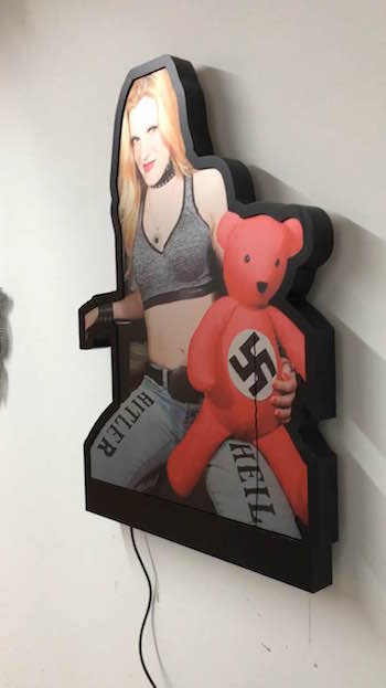 In May of this year, New York-based artist, Darja Bajagić, faced censorship at Bucharest’s Galeria Nicodim for a work entitled “Bucharest Molly” (2016). The motion-activated work depicts a woman in jeans with the words “Heil Hitler,” holding a red a teddy bear embezzled with a swastika oozing black liquid. The piece was commissioned for an exhibition called Omul Negru, curated by Aaron Moulton, and was set to explore “an anthology of evil words and images.” While Bajagić maintains the work was censored on account of its hyperconformity to the theme, Moulton argues it was part of an “editorial process.”
