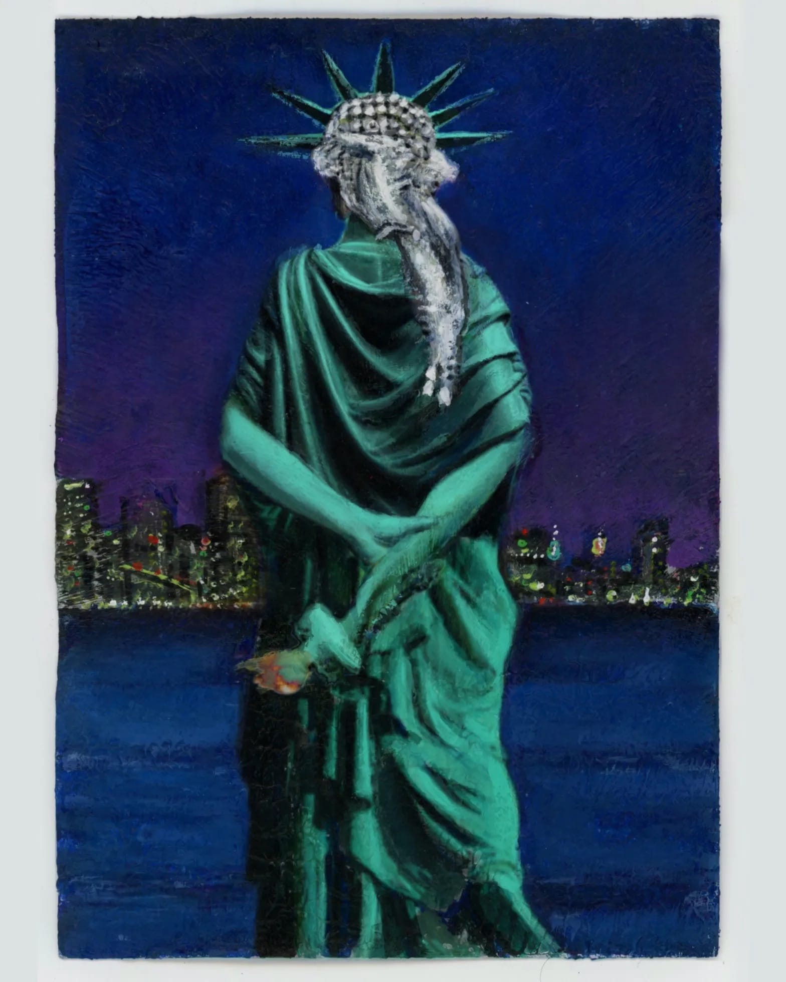 Ridikkuluz, a queer Jordanian-American artist living and working in New York, modeled his 2023 painting of the Statue of Liberty after Handala, Palestinian political cartoonist Naji al-Ali’s drawing of a 10-year-old refugee with his back turned to the viewer. Al-Ali was the same age when he was forced to leave Palestine, and specified that Handala is frozen in time and will only turn around and face the world once Palestinians are able to return to their homeland.