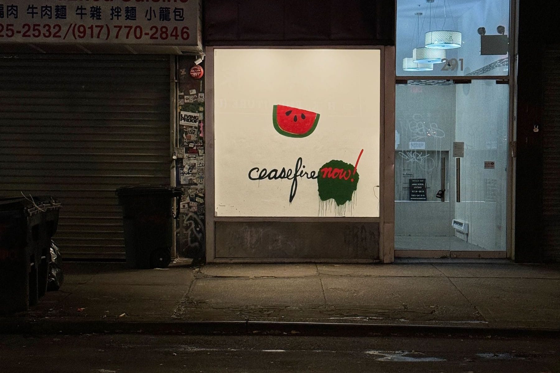 Hyperallergic Editor-in-Chief Hrag Vartanian created “Forbidden Protest Sign” (2023) for HOME gallery, a storefront exhibition space formerly run by William Chan on Grand Street in Manhattan, after originally planning to work on a piece about the blockade of Artsakh. “Sadly, the dictatorship of Azerbaijan attacked and forced out the 100,000+ indigenous residents in September 2023, emptying the area of its Armenian population for the first time in recorded history,” Vartanian remarked. He ultimately decided to display “Forbidden Protest Sign,” describing the mural as “about those things in democratic societies that are often curtailed and banned for various reasons.”