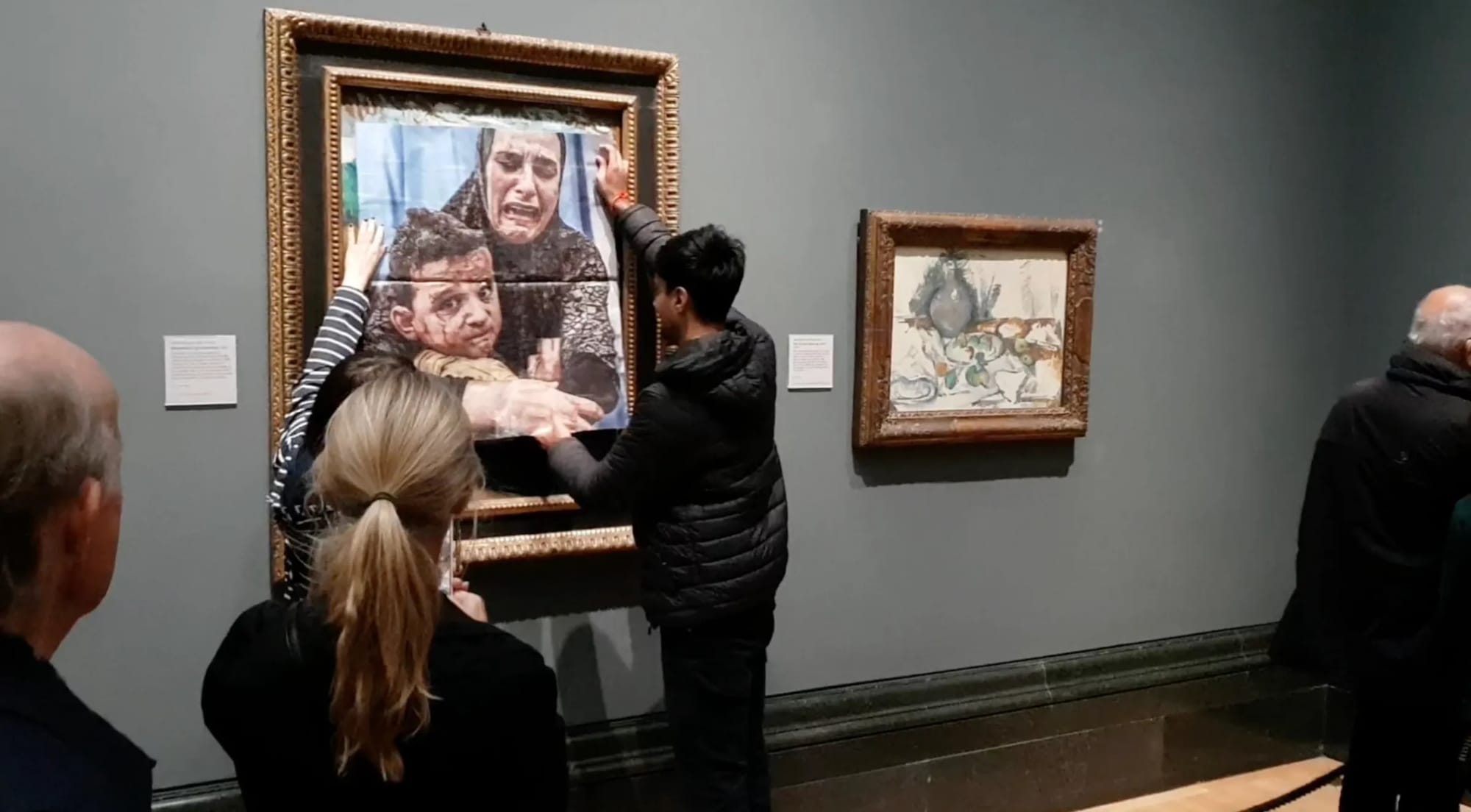 Two days after the anniversary of Hamas’s October 7 attack and the beginning of Israel’s attacks on Gaza, the British activism group Youth Demand staged a pro-Palestine demonstration by temporarily altering the appearance of a Pablo Picasso painting at the National Gallery in London. Activists Jai Halai and Monday-Malachi Rosenfeld affixed a large sticker of a sobbing Palestinian woman and her young son, whose face was covered in blood — a photo taken by Gaza-based journalist Ali Jadallah in the aftermath of Israeli airstrikes on Al-Shifa hospital — to the protective glass covering Picasso’s “Motherhood (La Maternité)” (1901).