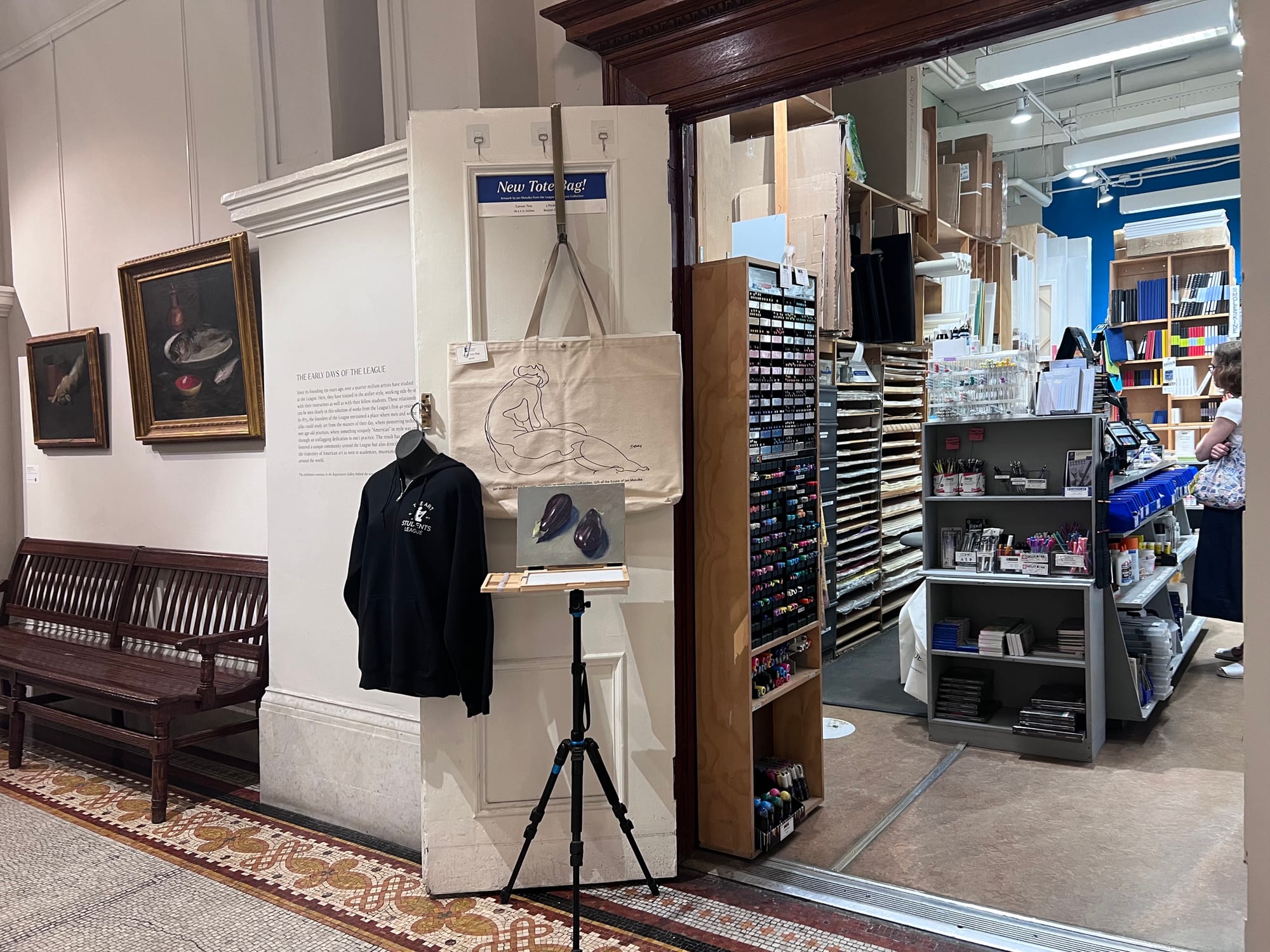 It begins in the windows facing the sidewalk, where works by League instructors Margaret McCann, Daisuke Kiyomiya, and Sharon Sprung meet the reflection of the buildings across the street, integrating its ongoing history with the city itself. The entrance hall puts you in the company of luminaries, with drawings by Norman Rockwell and Winslow Homer, and paintings by Georgia O’Keeffe and William Merritt Chase, among many others. These works could take pride of place in most museums, but here, they share space with such quotidian company as an elevator, an art supply store, and a fire alarm control panel, a testament to the casual abundance of the League’s collection. Enter the Registration Office and you might encounter drawings by Robert Henri, paintings by Max Weber, and sculptures by Alexander Stirling Calder, alongside a student asking about course credits.
