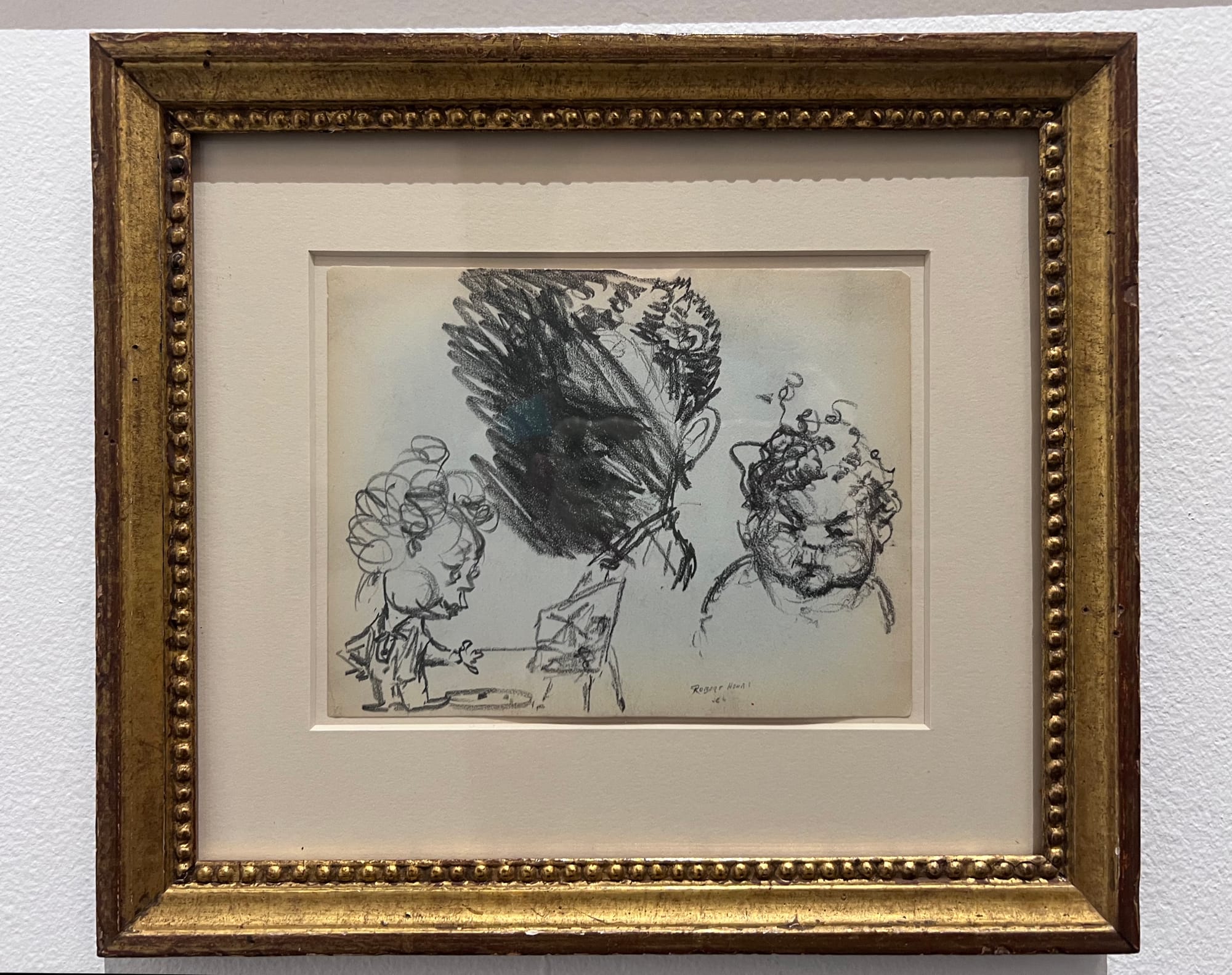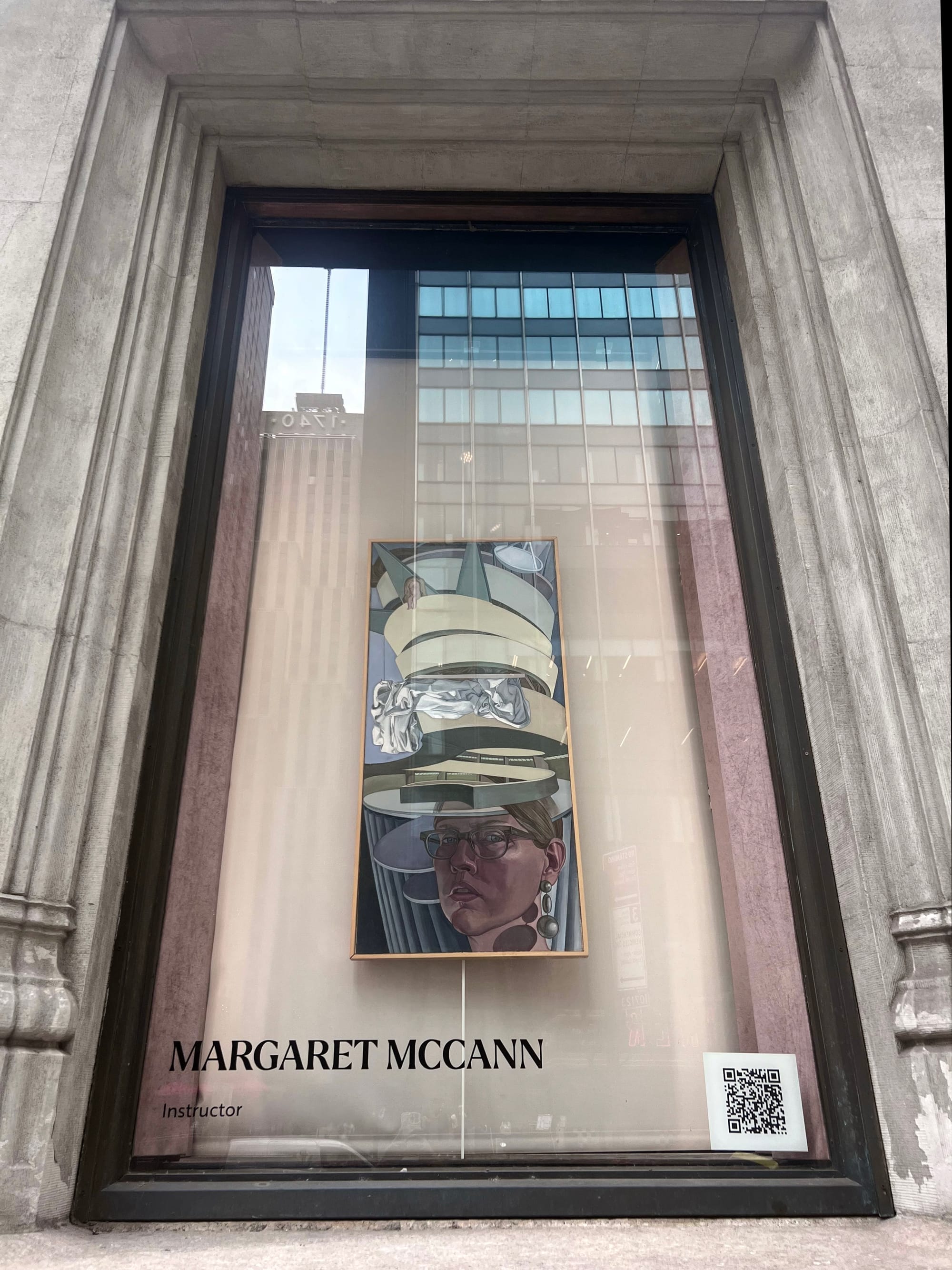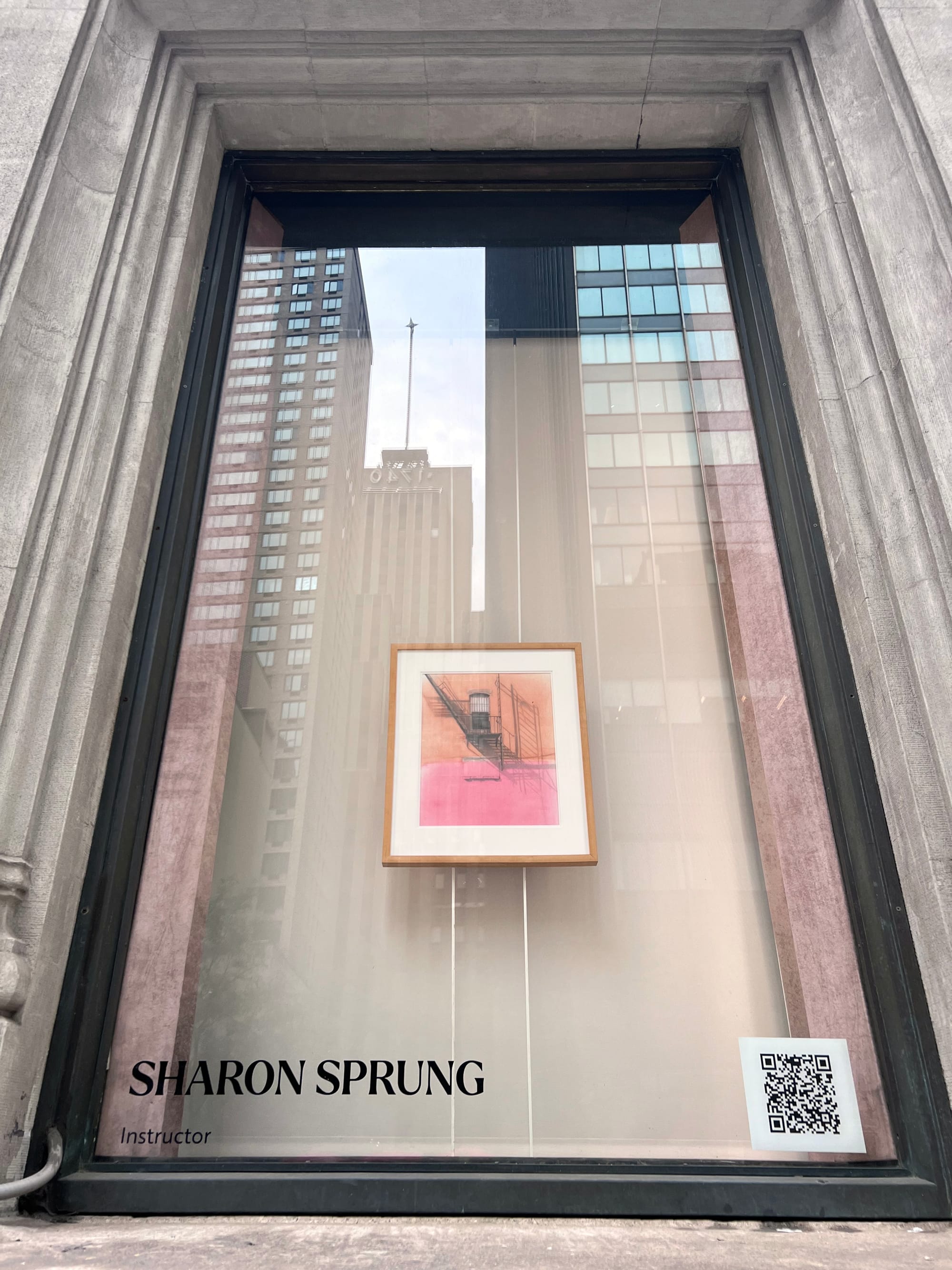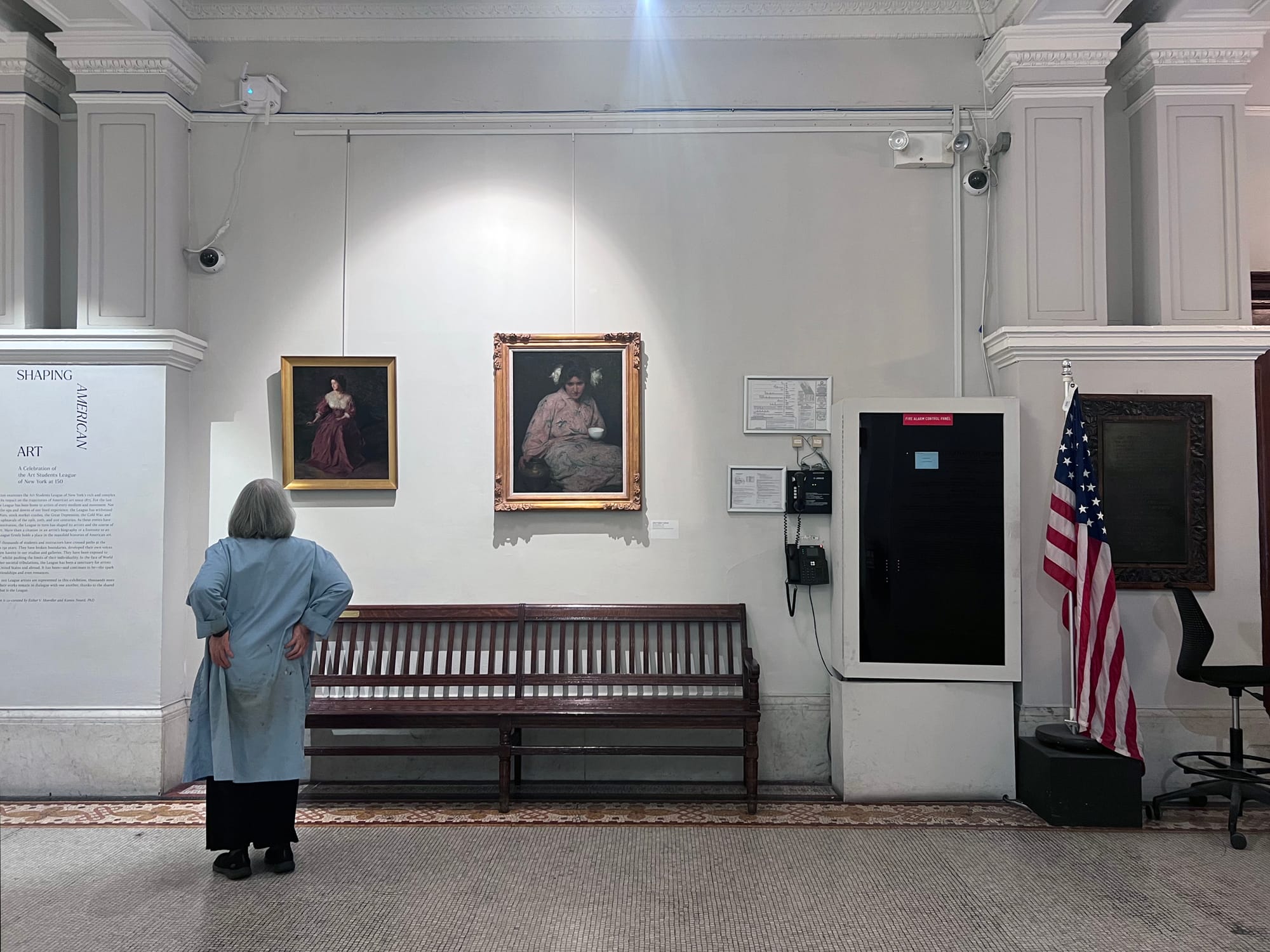 It begins in the windows facing the sidewalk, where works by League instructors Margaret McCann, Daisuke Kiyomiya, and Sharon Sprung meet the reflection of the buildings across the street, integrating its ongoing history with the city itself. The entrance hall puts you in the company of luminaries, with drawings by Norman Rockwell and Winslow Homer, and paintings by Georgia O’Keeffe and William Merritt Chase, among many others. These works could take pride of place in most museums, but here, they share space with such quotidian company as an elevator, an art supply store, and a fire alarm control panel, a testament to the casual abundance of the League’s collection. Enter the Registration Office and you might encounter drawings by Robert Henri, paintings by Max Weber, and sculptures by Alexander Stirling Calder, alongside a student asking about course credits.