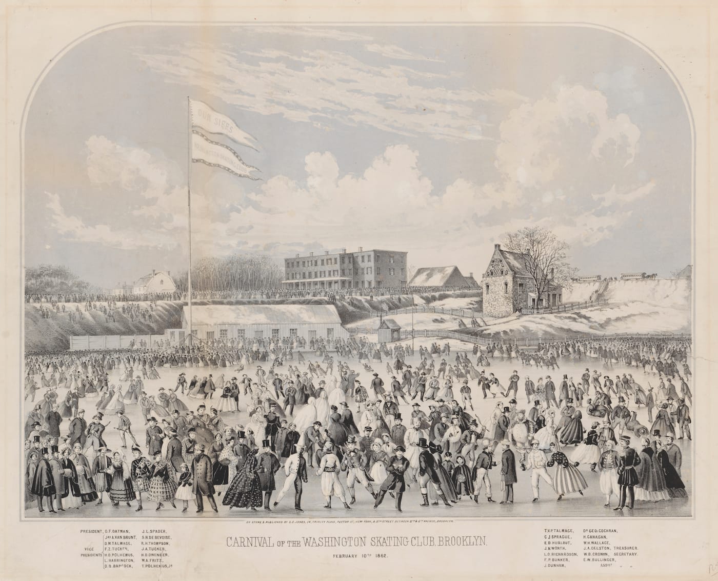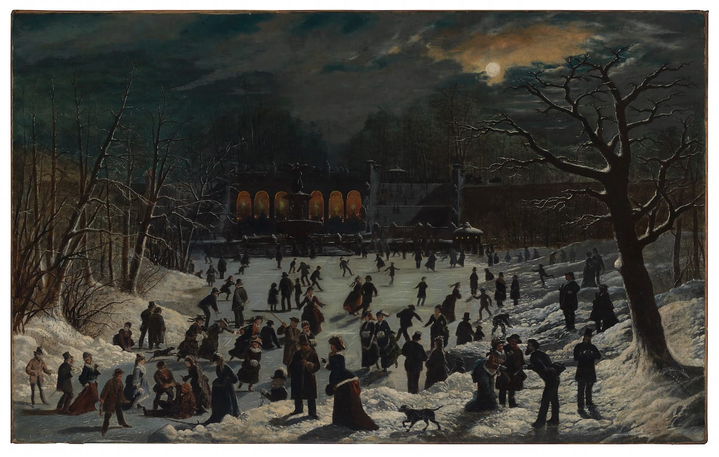 Central Park welcomed one of its top attractions years before the park was officially completed in the 1870s. The first dedicated ice-skating rink in New York City opened in the winter of 1858, drawing hundreds of thousands of city dwellers who wobbled and glided on the frozen lake near 72nd street. New Yorkers, en masse, were immediately transfixed by the activity, which was transformed from commonplace pasttime to thrilling recreation.
