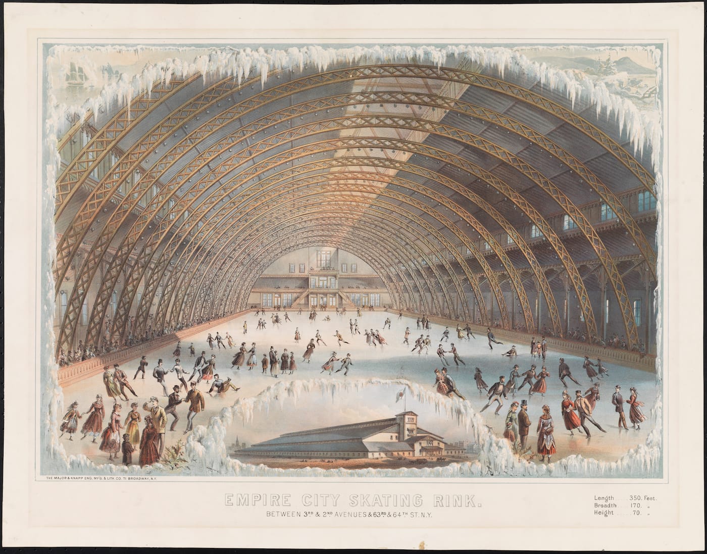 New York on Ice: Skating in the City illustrates the evolution of a colonial-era activity into a jazzy, commercialized one, but it also offers a lens into the development of the city’s built landscape from an unusual perspective. Although rink designs were informed and curbed by the urban environment, ice skating transformed the city’s architecture. Between 1896 and 1949, Rosenfeld found that over 15 rinks were built within a 20-block radius in Midtown alone. Some have since closed, but New York has been shaped by other rinks that have had the means to endure, from Rockefeller’s rink to the Wollman Rink — which reopened after Donald Trump repaired it (no, it wasn’t an act of philanthropy.)