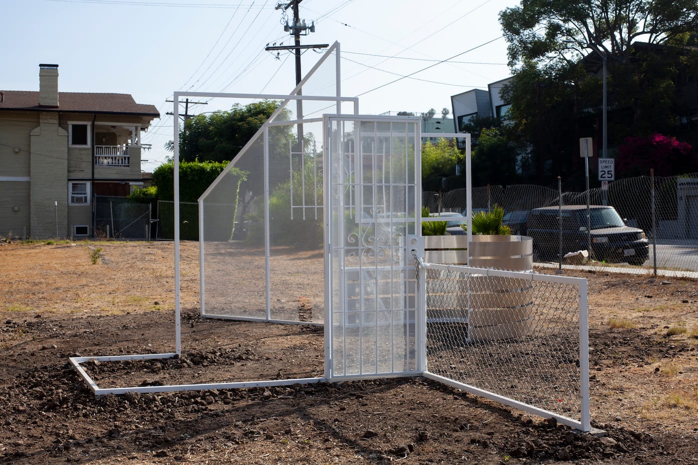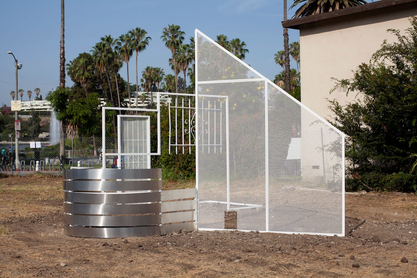 LOS ANGELES — In a razed lot near Echo Park Lake stands a confounding sculpture. Made from metal and coated in pale paint, its parts are recognizable but illogical: a door leading to nowhere is wrapped with chain through a hole where a doorknob would go, and a window grate is bolted loosely to the frame so that it wiggles in the wind, guarding nothing but the sky beyond it. It’s a house without walls, a frame without the drywall, but all made with standardized and familiar pieces. This temporary sculpture, “1601 Park” by artist Tanya Brodsky, illustrates how boundaries and privacy are defined by architecture in Los Angeles neighborhoods.