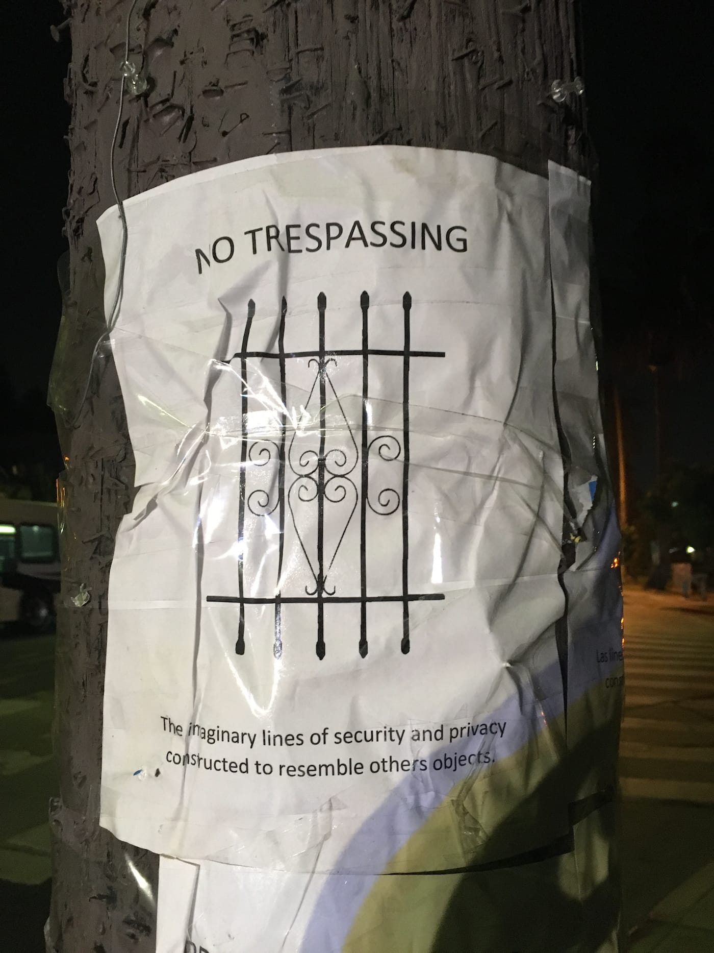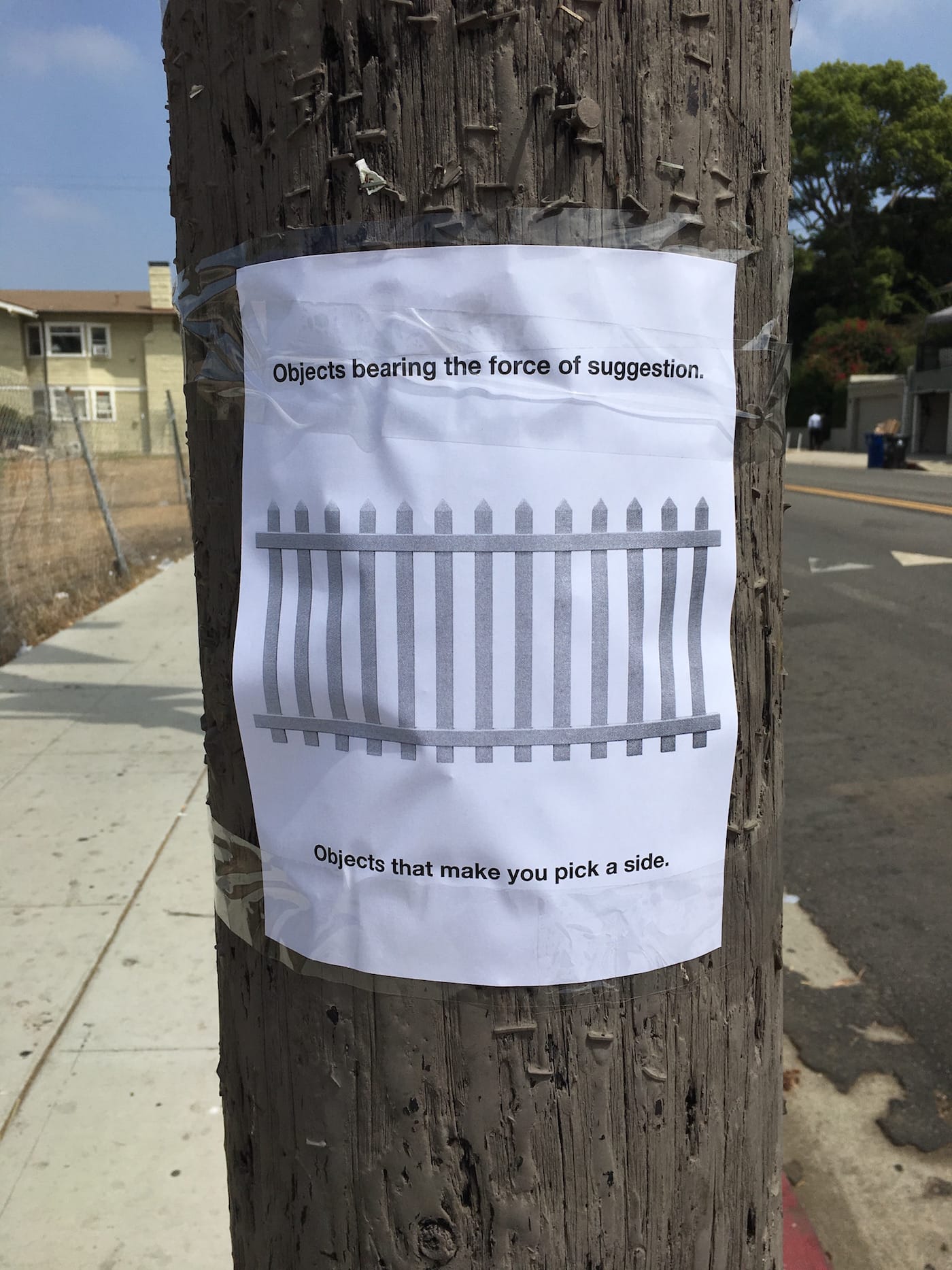 A few weeks after the sculpture went up, someone left a printed message with a rendering of one of Brodsky’s window grates taped to a wooden power pole on the adjacent sidewalk. The print out read: “NO TRESPASSING. The Imaginary lines of security and privacy constructed to resemble others objects.” Seeing it as a conversation the project aimed to start, Brodsky taped a print of a picket fence with her response: “Objects bearing the force of suggestion. Objects that make you pick a side.”
