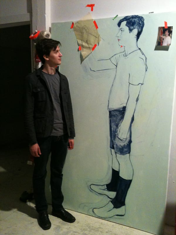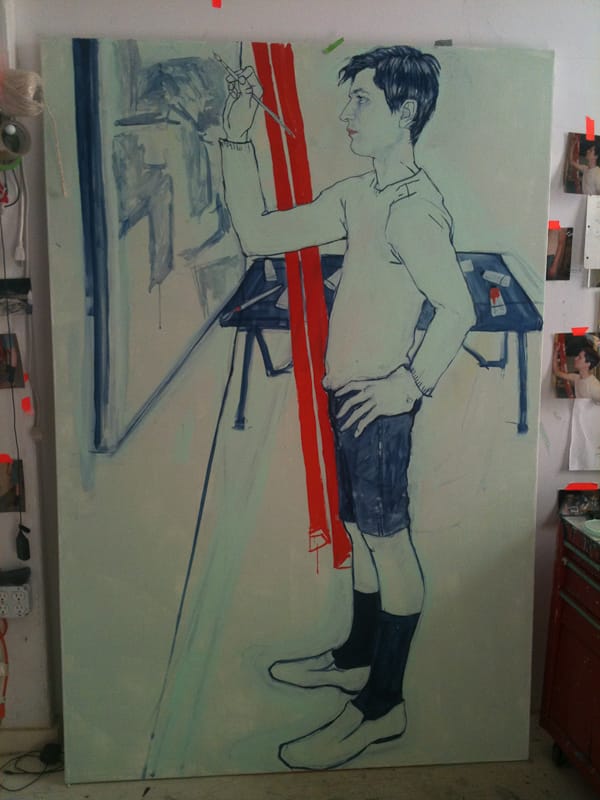 Beginning on Wednesday, the emails and text messages started pouring in. “You’re in The New Yorker!” was the notion of the generally congratulatory remarks. This was not untrue. But, it also wasn’t entirely accurate. My friend and former studio neighbor, Hope Gangloff, painted a portrait of me painting for her new current exhibition and a reproduction of it appeared in the “Goings On About Town” section. Although she adeptly captured my likeness, the portrait is very much Hope’s world. Granted, I am more or less wearing what I paint during the sultry New York summer months — cut-off skinny jeans, black socks, beige suede loafers (basically ragged clothes) — and it’s my lanky contrapposto.