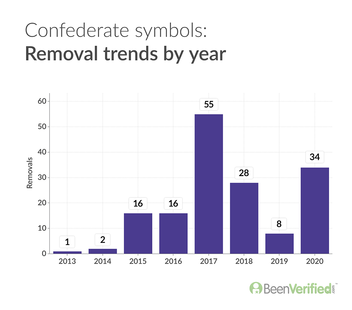 The study is based on an analysis of dozens of media reports from 2020 compared with data collected from a 2019 report by the Southern Poverty Law Center (SPLC). The SPLC tracked statues, plaques, schools, roads, military bases, buildings, parks, and other public monuments honoring former Confederate soldiers. BeenVerified’s study includes symbols that have been either torn down by protestors or officially removed by local authorities.