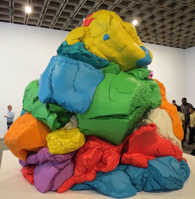 In art we have seen this tradition evolve in the works of Twombly, Lichtenstein (think specifically of his comic book based images), Basquiat, Haring, Dunham, Gober and Baechler. Not that there were not European precedents for such manifestations in the work of Rousseau, Dubuffet, and even Giacometti. Where a child playing with its own feces (biological formlessness) may constitute, as the psychoanalytical critic Donald Kuspit once claimed, primordial evidence of creativity, arrested at this level this impulse, no matter how abstract and seemingly transcendent, can yield a subject, the infinite child in us, if you will, and a whole culture, that is easily and endlessly mesmerized by shiny, hollow things. Saint Clair Cemin, an extraordinary sculptor, who knows a thing or two about the phenomenological parameters (and ‘cuteness’) of objects, finds Kuspit’s notion (obviously inherited from Freud) reductive, and argues contrarily “that the child who plays with his feces is simply an artist who is working with the material at hand,” that perception itself presupposes the creative act of representation, at all levels, biological and cognitive. Which is to say if we look for the infinite child rather than the infinite artist in us, then what we have minimally is psychoanalysis’s articulation of its own arrested development projected as reality, something Lacan and his contemporaries tried to redress. I don’t believe colorizing this symbolic mound of feces, if that is what this is and that is what Koons has done, even subliminally, in “Play-Doh,” can reverse the entropic function Smithson was trying to document in “Spiral Jetty.”