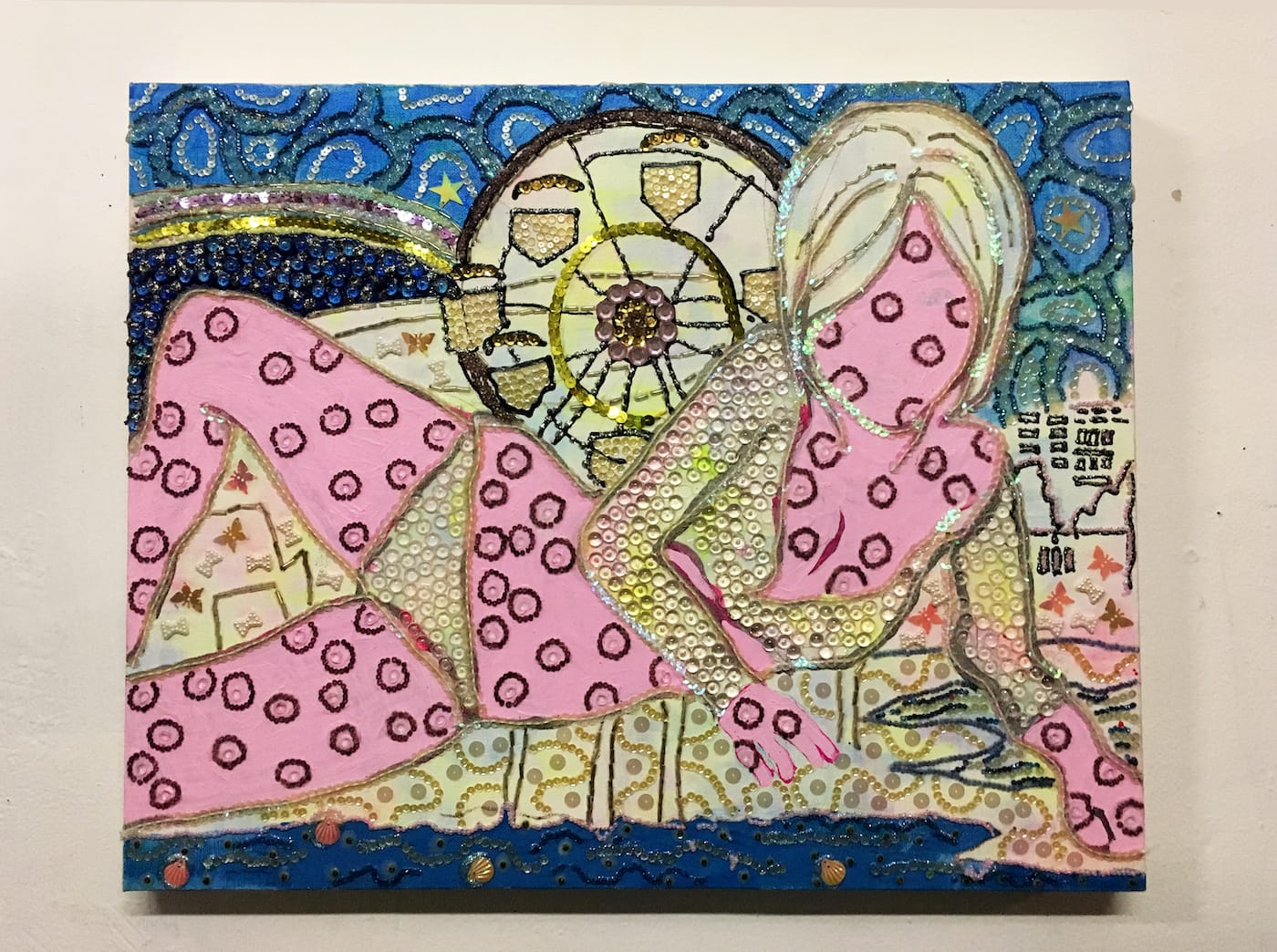 Aska Irie’s wall works are made of materials you’d find in a kindergarten ats class: pipe cleaner, sequins, rhinestones, glitter, and perler beads — the tiny plastic pieces used to make mosaics by placing on pegboard and running over with a hot iron to fuse the beads together. Irie’s world feels like a playground; her canvases are full of cartoonish sumo wrestlers, snails, and mythical creatures.