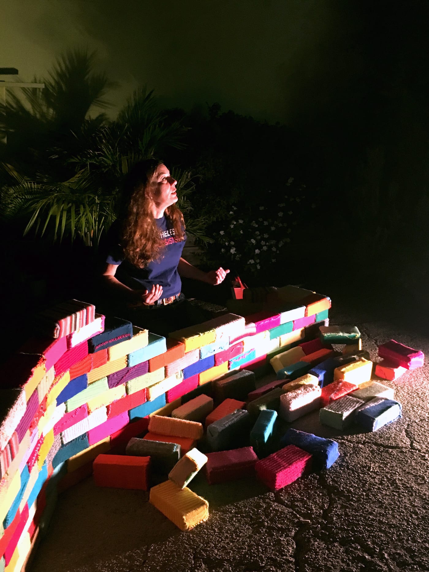 Separate from the main stage, artist-in-residence Arzu Arda Kosar held a durational performance in which she assembled Map of California: crocheted bricks stacked into the shape of the California coastline. The plush yarn enveloping the bricks, which made them appear soft and safe, actually made the bricks’ flat surfaces uneven, causing the structure to be wobbly and more likely to fall apart. At one point, the Central Coast toppled over and Kosar was forced to rebuild it.