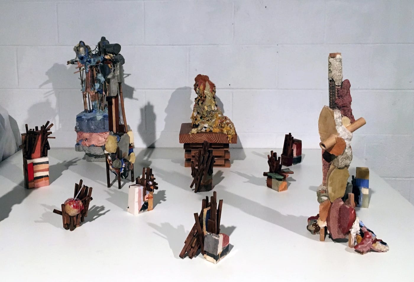Apart from the performances, the open studios offered a look into the lives of the international and local artists who have spent the year at the 18th Street Arts Center. David McDonald, one of the few formalist artists in residence, crafts spindly sculptures made from fragmented pieces of wood, sand, and polyurethane grafted onto bamboo spines. He stretches dense elements into thin architectural structures, like columns and bridges, which create gaps that test the strength of the material.