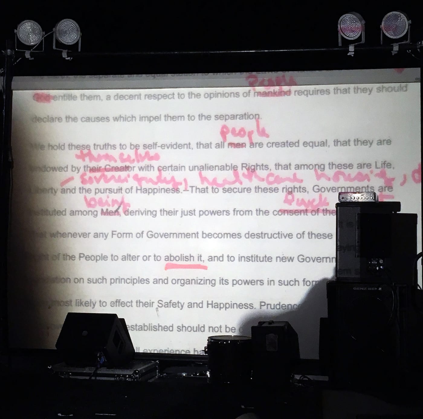 Iranian artist-in-residence Amitis Motevalli fired up an overhead projector and slapped down a transparency of the Declaration of Independence. With class in session, she worked with the audience to collaboratively re-write the document. She changed out the word “men” for “people” or “beings” and crossed out all references to King George III. In one sentence, an overtly racist description of indigenous people was crossed out and replaced with “fuck that.” Motevali’s performance showed how inadequately the Declaration of Independence serves the broad culture of Americans in 2018 (let alone 1776) and how it might be ready for the country to re-think who, specifically, is equal in the eyes of the government.