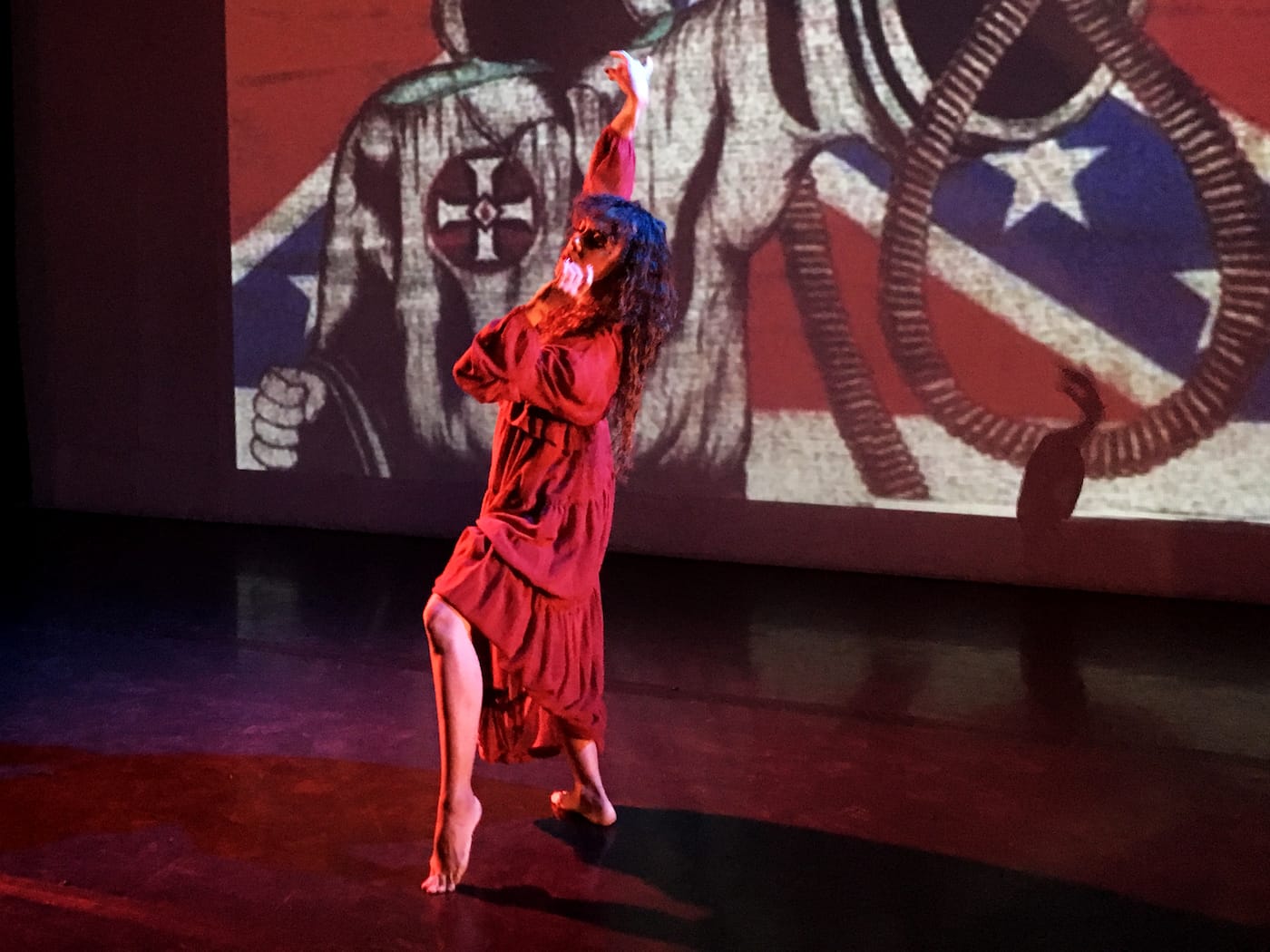 Bethany Ward-Lawe’s performance in the Highways Performance Space began as a screening. Without warning, we were shown the notorious footage of Los Angeles police officers beating Rodney King to death. The video proceeds to juxtapose the 1991 incident with more recent footage of news reporting the deaths of Trayvon Martin, Philandro Castile, Michael Brown, and the subsequent Ferguson riots, and an interview with the emerging Black Lives Matters movement’s organizers. Ward-Lawe then entered on stage, passionately executing an interpretive dance set to a Jeff Buckly cover of “Strange Fruit.” Behind her, the footage shifted to violent, historical images of black violence. But then the music picked up, transitioning into Kanye West’s “I’m Up in the Woods,” and more revolutionary images cut through the racist montage; the march on Selma, Tommie Smith and John Carlos’s black power fist-in-air at the 1968 Olympics, and Black Lives Matters rallies. Ward-Lawe changed into a black hoodie, raised her arms in the “hands up, don’t shoot” pose that has been appropriated into a protest call, and fell to the ground as the sound of a gunshot rings through the theater. The last image listed the names of all the black Americans shot by police between 1999 and 2016, a slide so dense that it could only be skimmed before the stage went dark.
