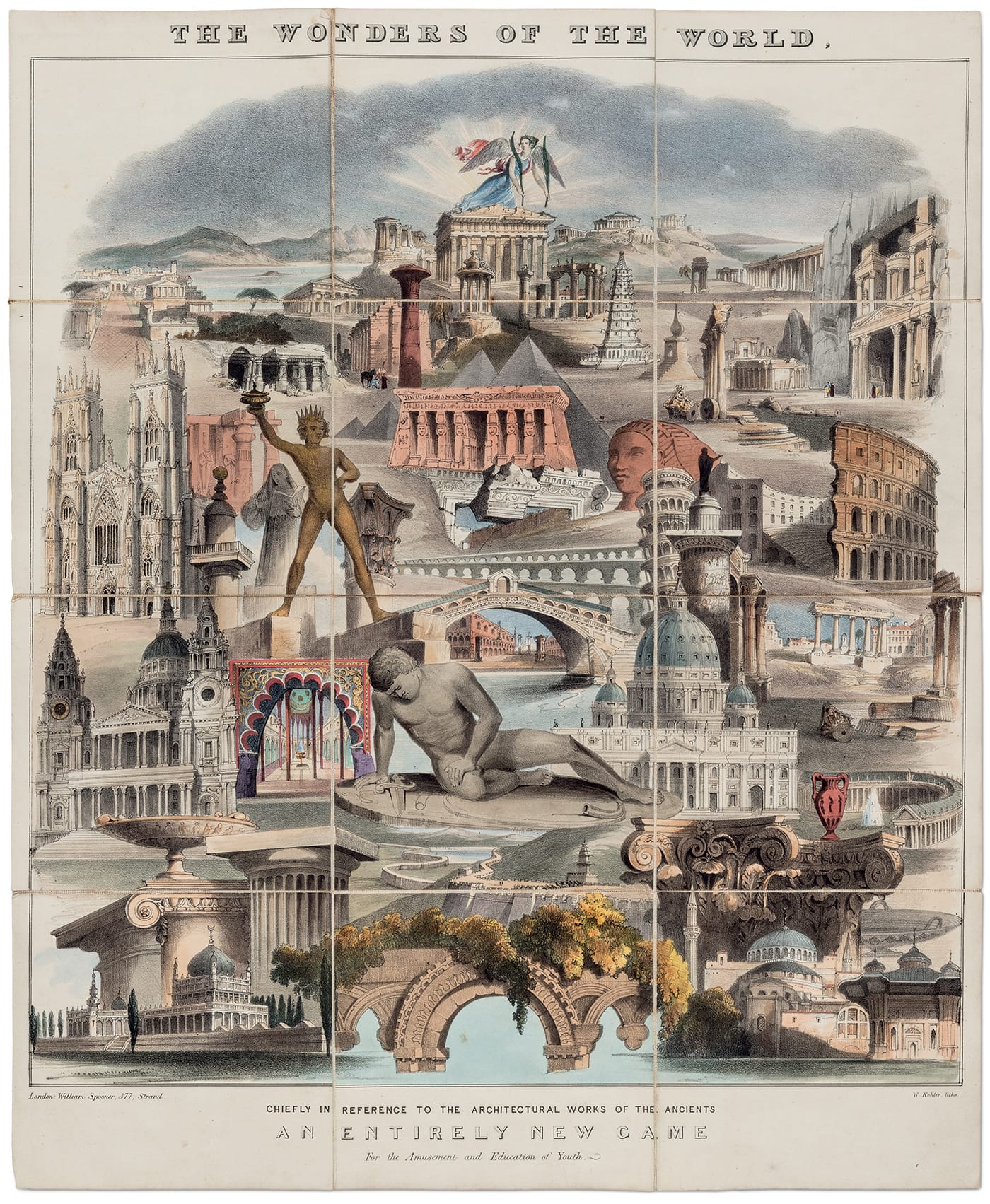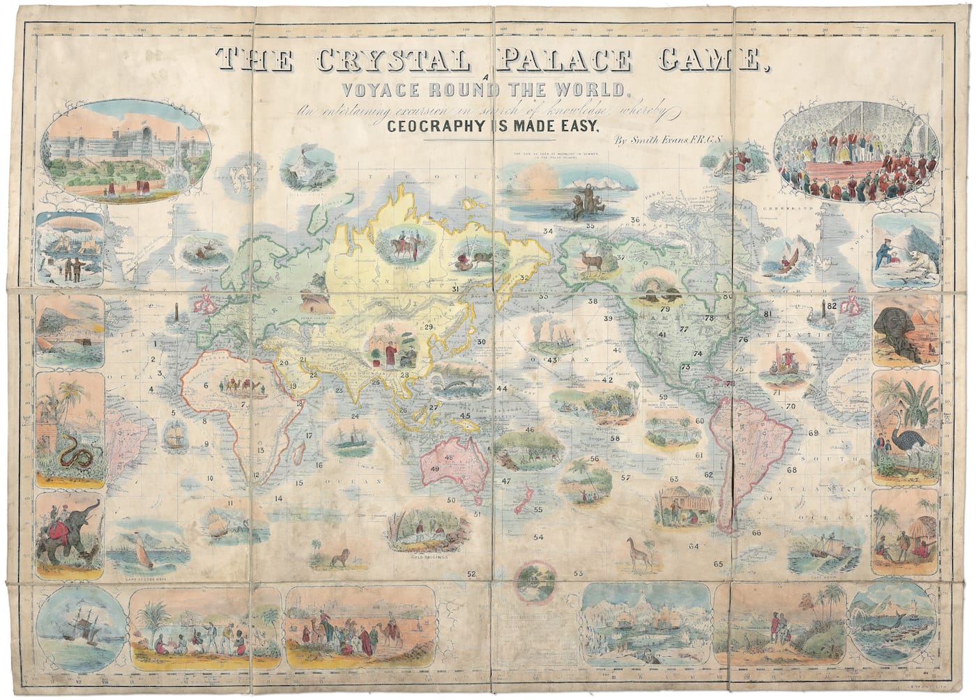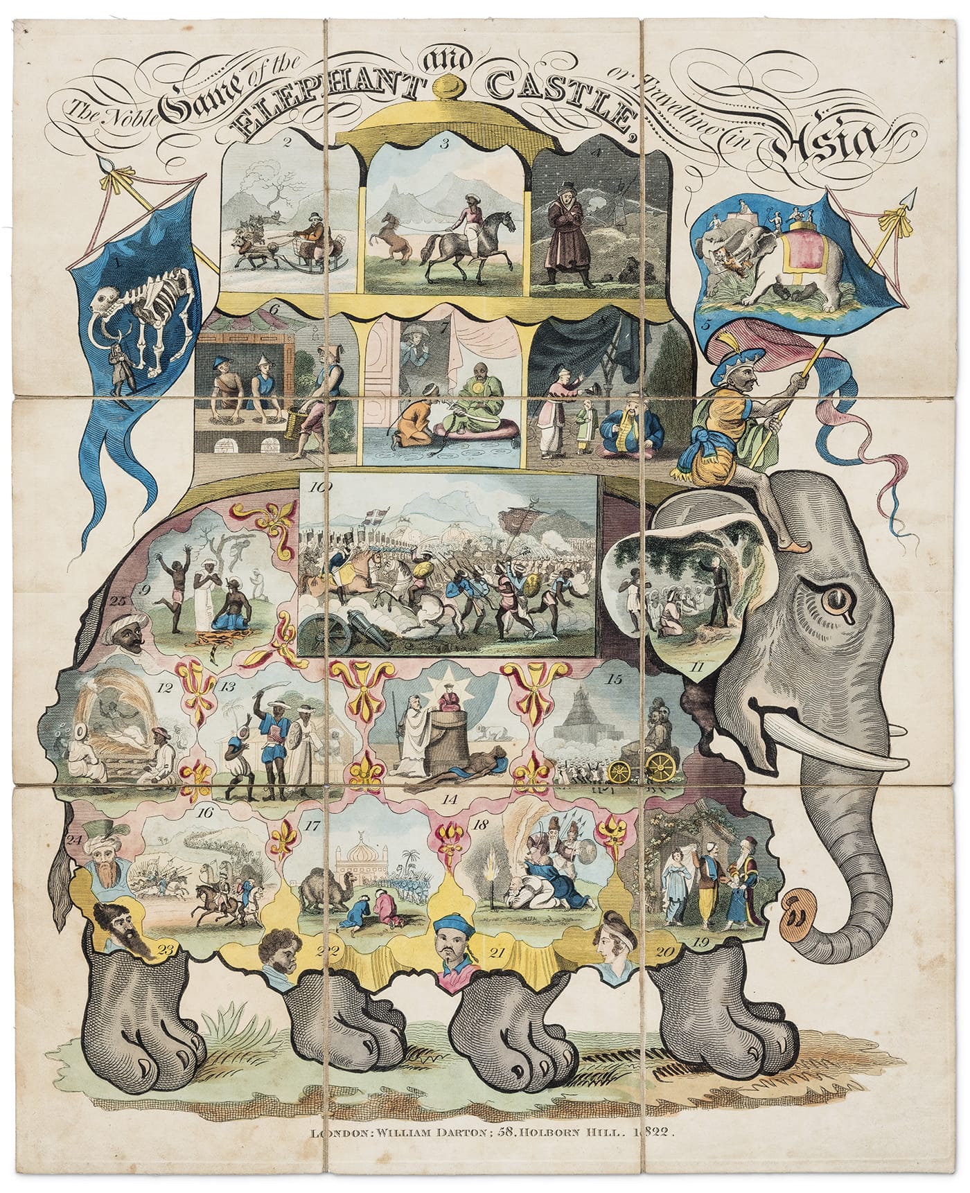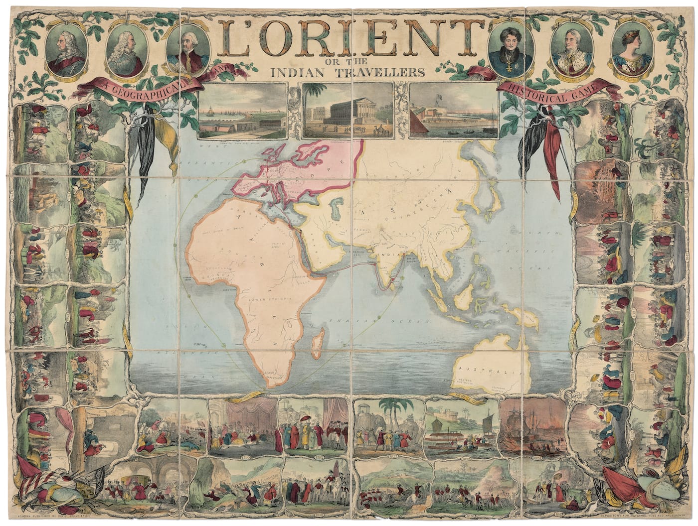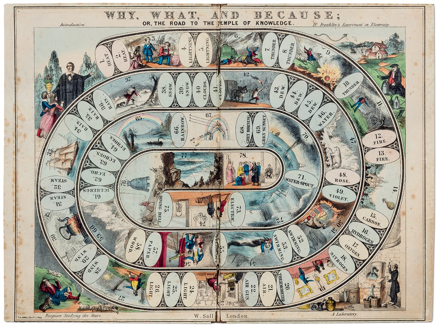 Publishers deliberately merged education and entertainment: they shrewdly realized that such games would appeal to parents. A. Robin Hoffman, from the Yale Center for British Art, explains in the book’s introduction: “As the turn of the 18th century approached in Great Britain, more and more parents and teachers embraced a suggestion from the philosopher John Locke that ‘Learning might be made a Play and Recreation to Children.'” Publishers, she writes, had recently introduced the genre of children’s literature, and board games were the natural next step, particularly as printing technologies evolved.