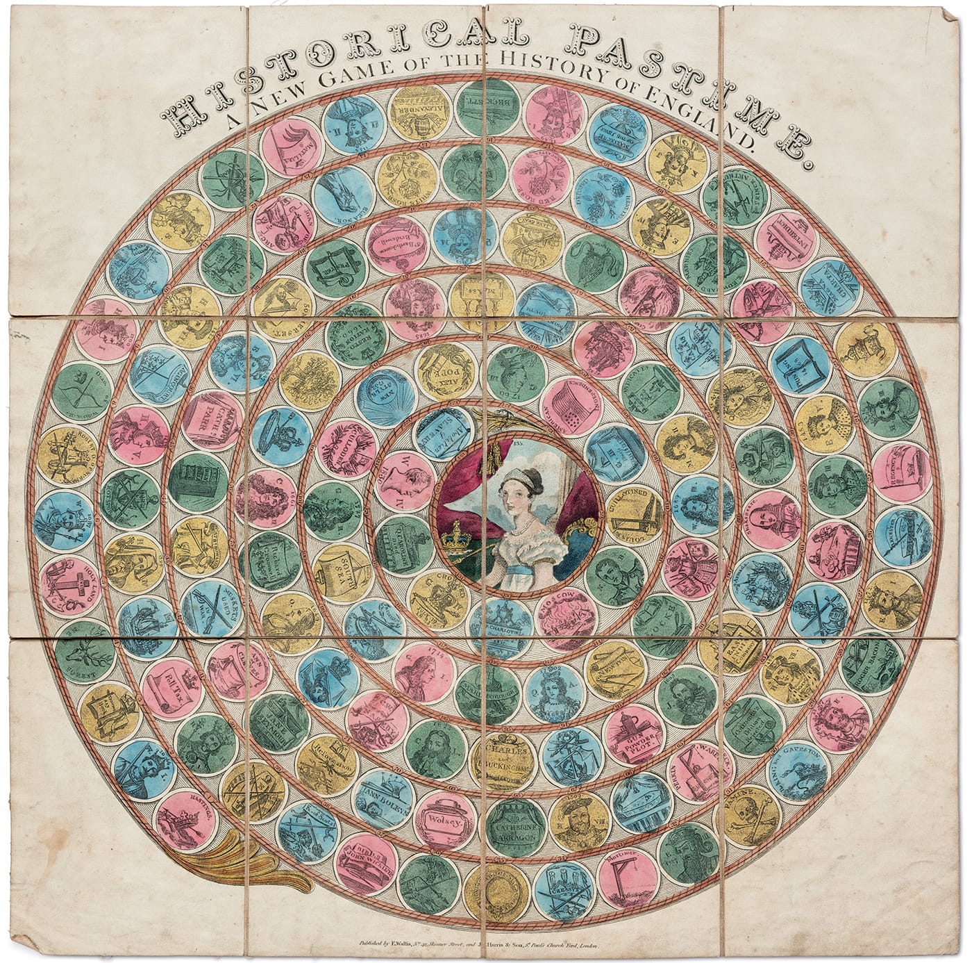 Georgian and Victorian Games: The Liman Collection is divided thematically to illustrate several trends. Some games were for pure entertainment, while others aimed to more deeply engage the minds of their young participants. There were games that dictated moral values as players advanced along paths towards virtues or vices; games designed around geography and British history; and instructive games, requiring players to memorize facts on subjects from math to astronomy.