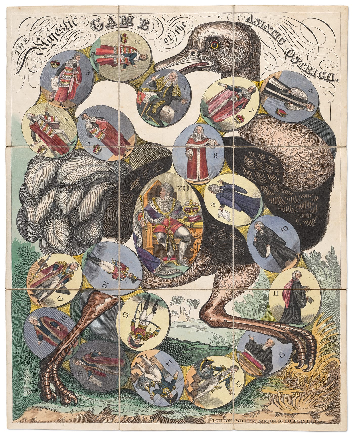 For years, collectors Arthur and Ellen Liman amassed dozens of these now-uncommon artifacts by searching yard sales, flea markets, auctions, and online markets. Board games tend to fall apart with use, and many were discarded by their owners, but those that the Limans acquired were impressively intact. 50 examples, mostly from the 1800s, were recently compiled in a lavishly illustrated book published by Pointed Leaf Press, representing a half-century of this early social tradition in England.