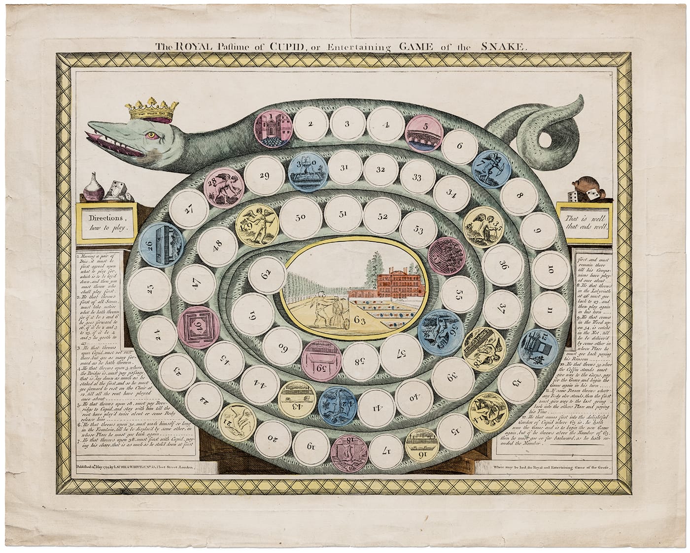 Around the early 1800s, British youth were gradually introduced to a new form of recreation: the board game. These activities, often hand-colored and printed on linen or board, were published by book manufacturers who competed to produce intriguing schemes and visually striking artwork. Parents, consequently, had a wide variety from which to choose, from race games — such as variants of the Game of the Goose — to trivia games.