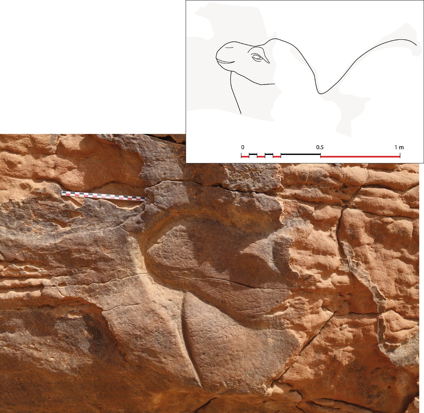 Archaeologists discovered rock art depicting about a dozen life-size dromedaries and equids.