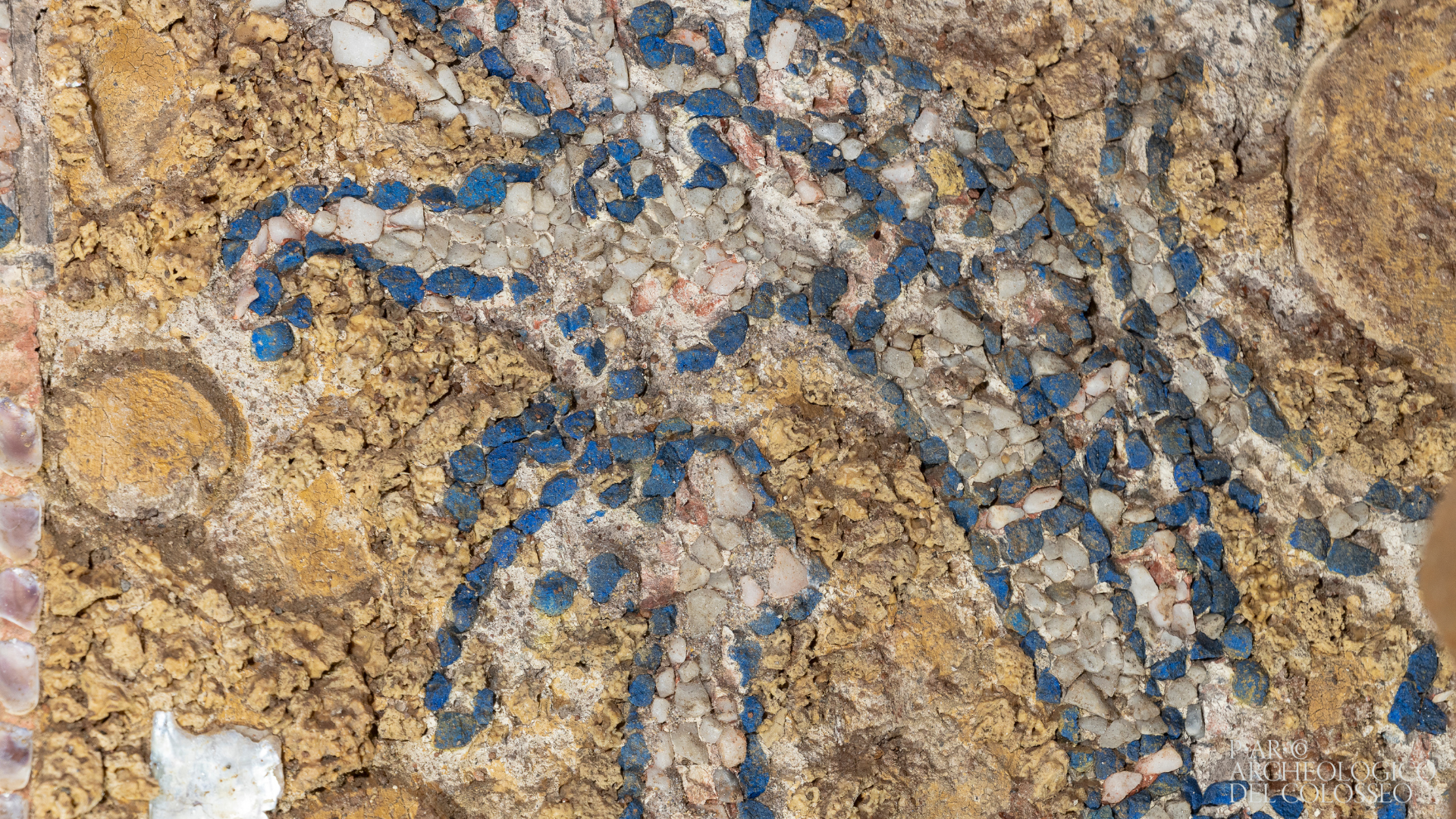 Studded with precious glass, shells, minerals, and blue Egyptian tesserae, the mosaic was unearthed by archaeologists in what was once a wealthy townhome.