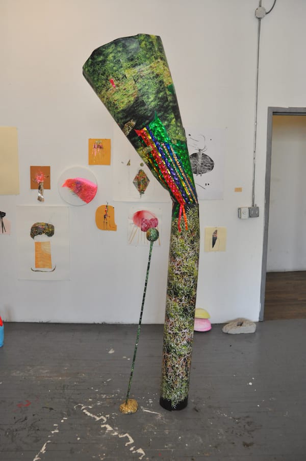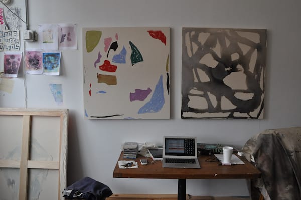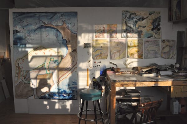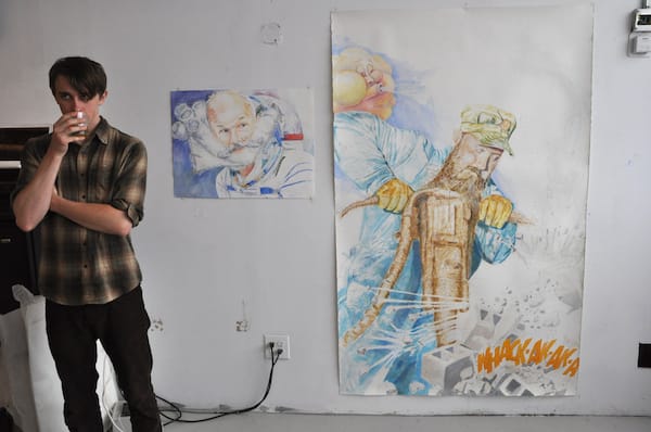Some of the watercolors in Warren Thomas’s studio. Thomas is currently a contributor to Hyperallergic but wasn’t when I snapped this pic. The work on the right is titled “Whack-ak-ak-a” (2010).