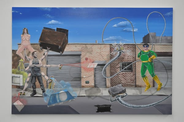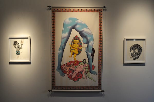 An installation at the English Kills Art Gallery show with a work by Don Pablo Pedro, “Peony Creampie” (nd), flanked by smaller works by Judith Supine, “Serpent Handler” (nd) and “Black Death” (nd)