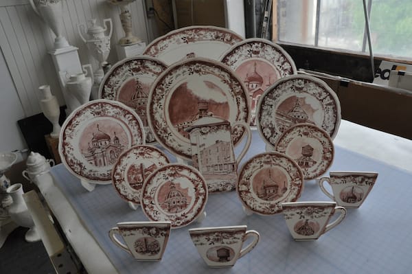 Cardboard works by Susan Hamburger that resemble porcelain and depicts well-known Wililamsburg landmarks.