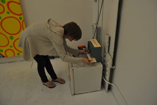 Artist Lori Kirkbride demonstrating her punch card system. She punches in every time she goes to comes into and leaves her studio.