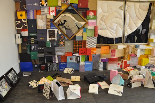 This artist, Kohei, gathered retail bags from stories across New York and Tokyo. The silk works are by Mayuko Okada.