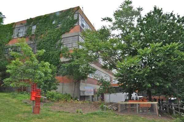 An orange sculpture by Tyrome Tripoli amidst a very Bushwick setting in the backyard of the Onderdonk House with chicken coop and facotry building.