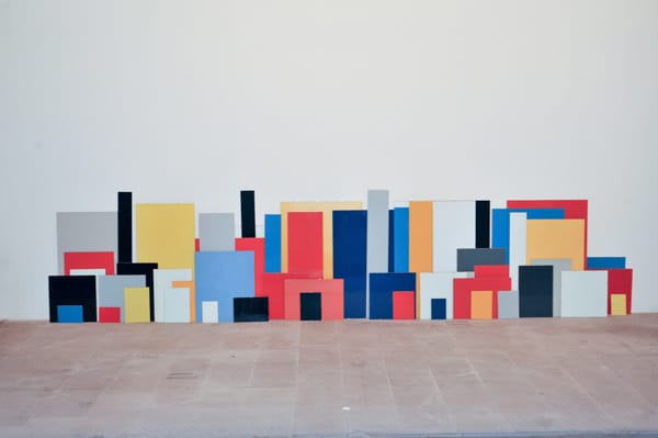 The components of several Mondrian (and other various abstract modernist composition painters) separated into their solid colors and re-represented by painting a vast amount of differing shaped and sized, cheap, commercially available colored glass clip frames, exhibited casually, leaned against the wall as a random abstraction.