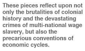 These pieces reflect upon not only the brutalities of colonial history and the devastating crimes of multi-national wage slavery, but also the precarious conventions of economic cycles. Markets both big and small, from the global stock trade to the art market, revolve around plundering and chance. Someone can be famous or rich and then loose everything in a second.