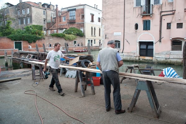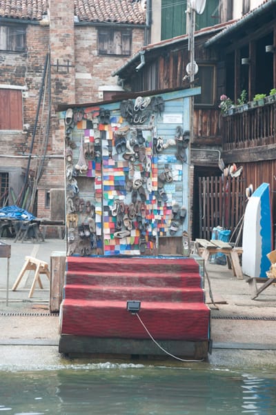 In order to find it, you had to sneak through a small two-man gondola production house, but even then, the only thing to experience was broken wooden shelves housing tools. Only later, while leaving, could I see the hidden, crude and capricious effigy made of old shoes and colorful scraps. Standing inside that hazardous shed, coyly watching the two men sanding and shellacking small boats, the scene was beautiful. There, blanketed by the fuzzy signal of the radio playing a soccer game, I spent my last hour in Venice. It was the most intimate and beautiful experience to be seen that week, and for the first time on the trip, my heart was broken in a good way.