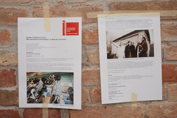 Countries that can’t even afford pavilions inside little galleries do it the best way — with scotch tape and some paper, as did the representatives of one of the most interesting countries I have ever visited, the territory known as Transnistria. To date, the biggest impression any single place in the world has had on me is this unrecognized, breakaway pseudo-country locked between Moldova and the Ukraine. As proof of actual political friction, when I asked those involved with the Moldova exhibition for information regarding the Transnistrian pavilion, they had no idea what I was talking about, even though they were listed together in all the press catalogues under the Moldova heading. The artist collective Moë, whose members are all originally from Transnistria, created the piece that touched me the most of all at the Biennale.