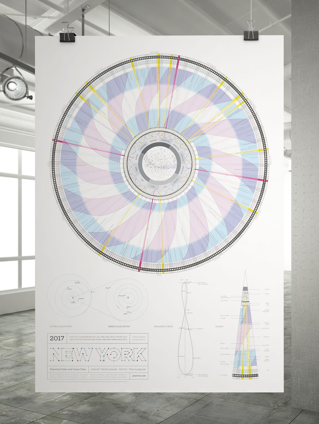 For people with a lot of wall space and appreciation for elegant data visualization, the poster-size Anaptár calendar by Anna Farkas with the Hungary-based Anagraphic charts data for lunar phases, sunrises, constellations, and other cosmic information. Each is customized for a different city, from New York to Tokyo to Budapest. [Anagraphic, €35.43 ($38)]