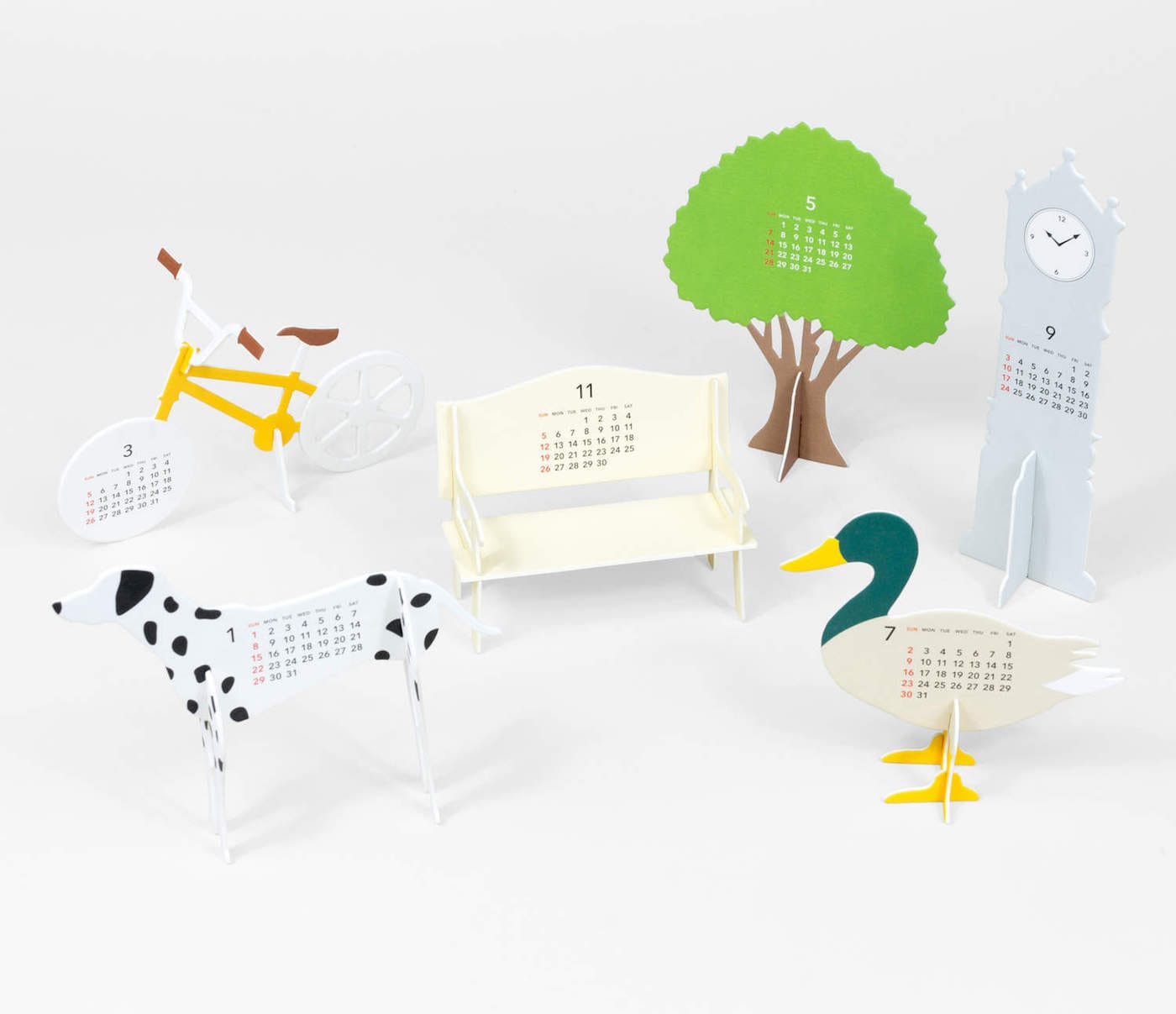 With the Park Calendar you can assemble a duck, a dog, a bench, a tree, a … clock tower? Just like your neighborhood park! The design by the Japan-based Good Morning includes two months on each of the six papercraft objects, which can offer a bit of outdoor harmony on your desk. [Walker Shop, $28]