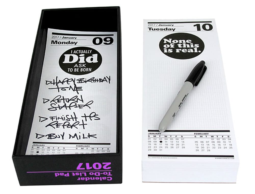 Are you the kind of person who makes a list each morning, perhaps what to get at the grocery store or reasons to live? The 2017 To Do List Calendar Pad by artist Ryan McGinness offers 365 days of gridded space for your words. Each has a small illustration at the top, featuring messages like “Free Parking” and “None of this is real.” [Gingko Press, $24.95]