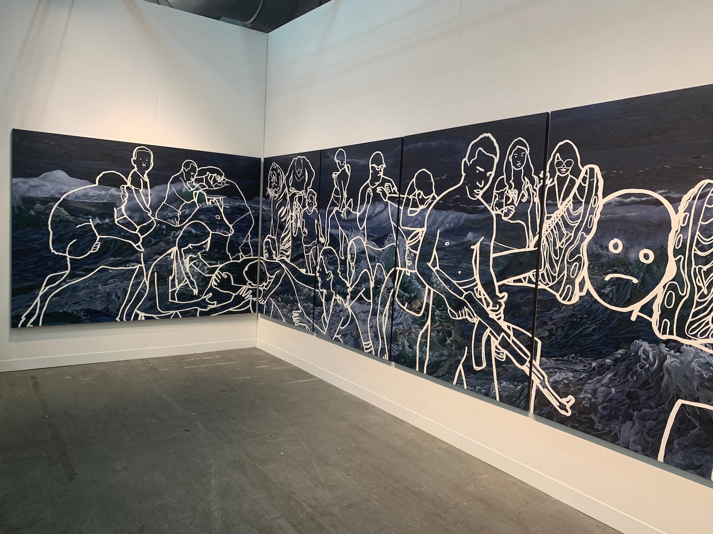 At the Fridman booth in the Presents section, the painterly lines of Wura-Natasha Ogunji’s sewn and inky multi-panel work “Unfinished” (2020), beckoned me closer to its enchanting tangles of indigo thread. Similar in palette and even larger in scale, Abdul Abdullah’s multi-panel tableau “Custodians” (2020) took up the entirety of the Yavuz Gallery booth. The Australian artist’s succession of writhing, dramatic figures recalls a classical processional frieze and enacts an astute critique of environmental recklessness at a time when Australia continues to be devastated by wildfires.