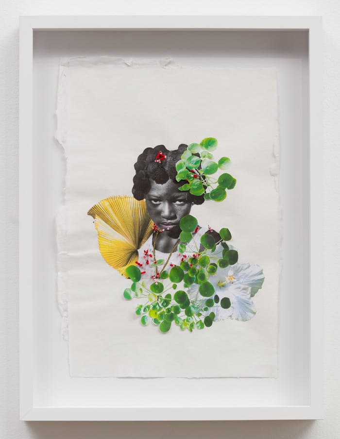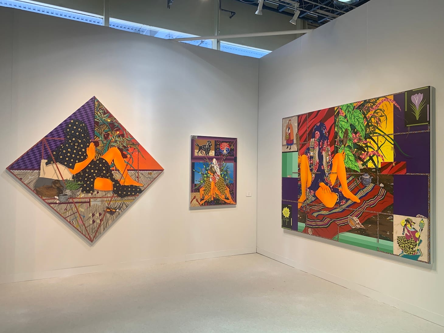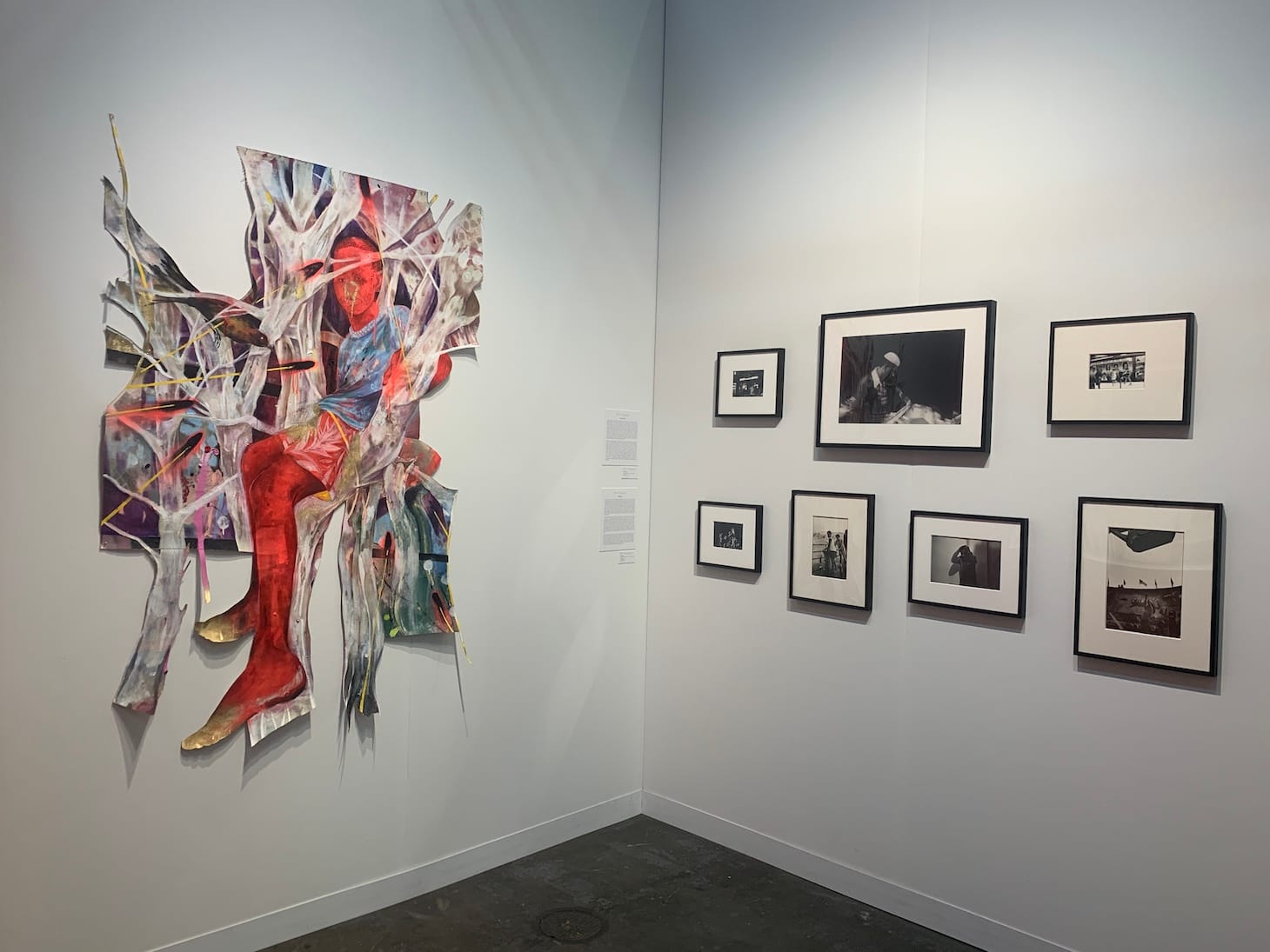 Also captivating are the collage-based works of Andrea Chung, on view in Klowden Mann’s booth, which layer archival images of Caribbean people with ink, beads, and brightly colored foliage made from cloth. A number of Chung’s cutout works, which position ominous voids amid archival images of laborers, are also on view, deepening the impact of her research-based practice which typically considers labor, material, post-coloniality, and the body in relation to the Caribbean.