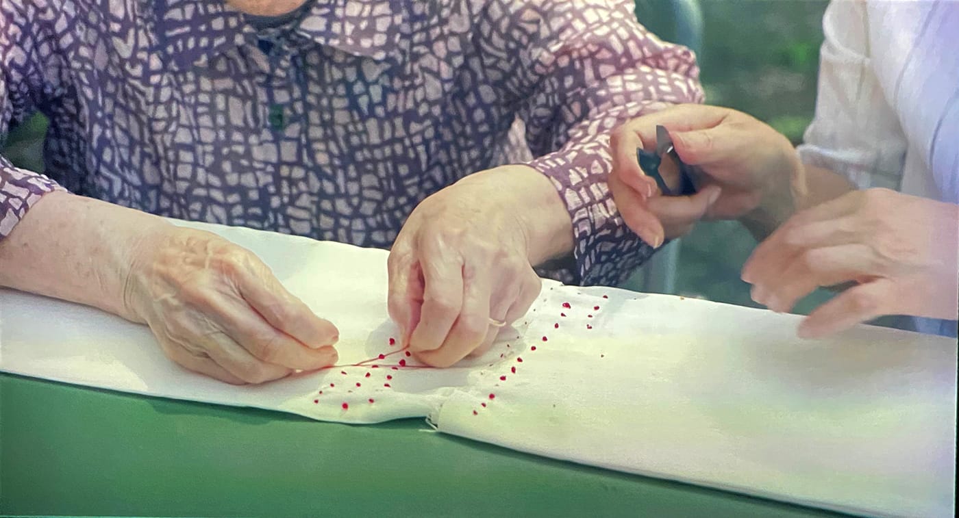 Arai’s video, “Anti-Monument for 1000 Women and the Former Imperial Japanese Army Clothing Factory, Hiroshima” (2020), features a grandmother, her adult daughter and grand-daughter, and a great-grandchild sitting together at a table making a senninbari. Embroidered with 1,000 red-dot stitches (“senninbari” literally means “thousand-person-stitches”), these good-luck-charm waistbands were produced by teams of women for Japanese soldiers who fought in the first Sino-Japanese War (1894-1895) and again in World War II. Arai is also showing tiny daguerreotypes, each one depicting a single senninbari stitch.