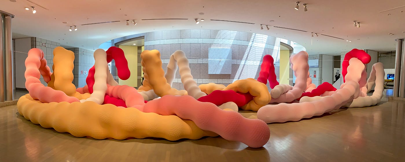 While there are visual bonbons on view among the Triennale’s offerings — the London-based, Spanish artist Eva Fàbregas’s big, colorful, intestine-like “Tangles” (2020), or the American Nick Cave’s delightfully riotous “Kinetic Spinner Forest” (2016 and 2020), a thicket of hanging, rustling, colored metal discs and ornaments, to mention two examples — in general, it is the Japanese artists’ works that interest me the most.