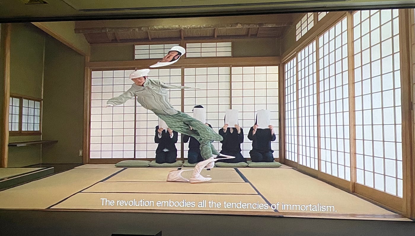“Death is the primary root of evil,” a nameless narrator intones. Skeleton-costumed figures perform a danse macabre, and a typical, uniformed Japanese worker dissolves into ectoplasm in a tatami-matted room. Expressing an unexpectedly ambitious idealism, the video’s narrator declaims, “Immortalism raises the question of interplanetarianism.”