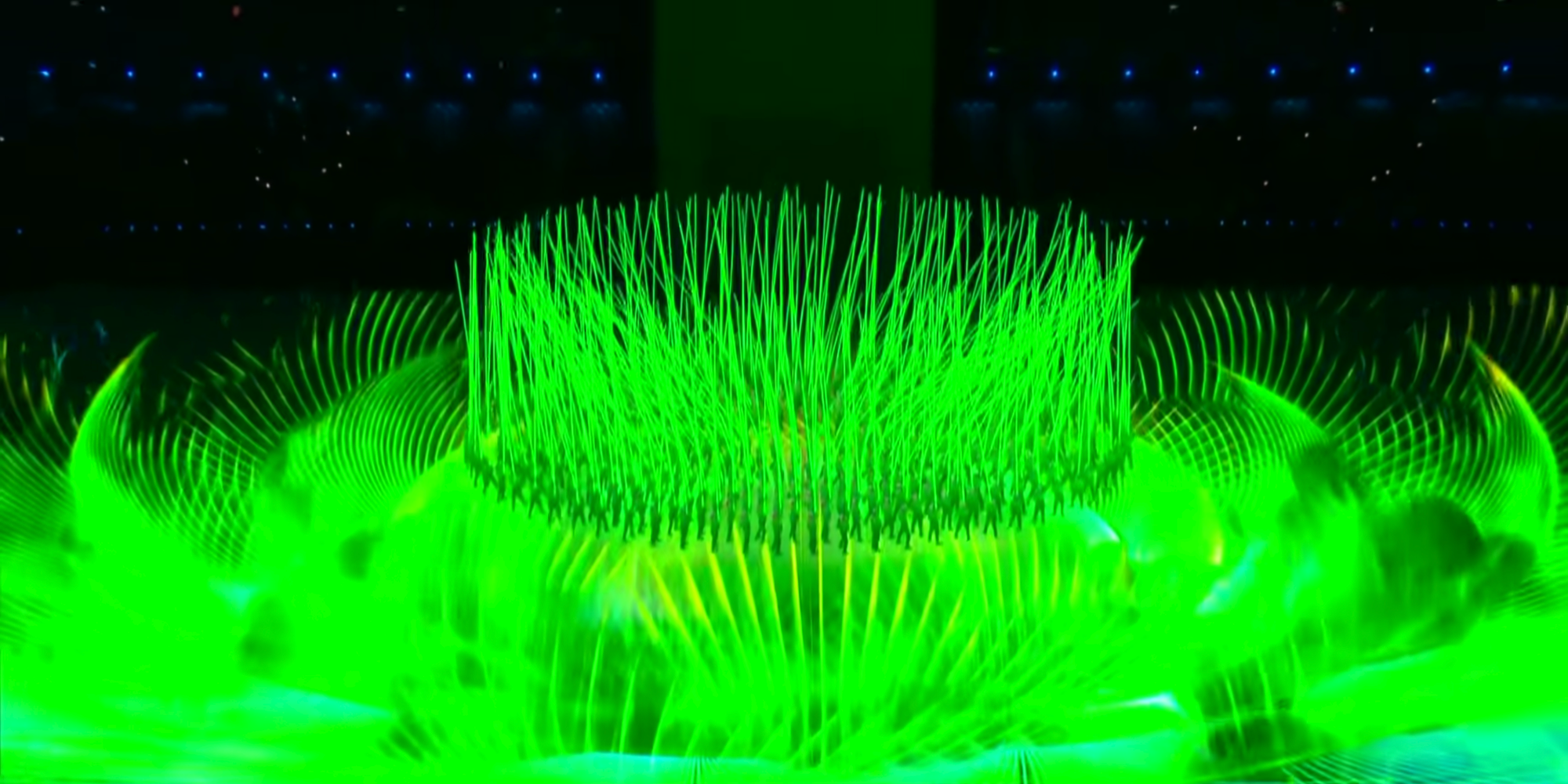 The ceremony opened with a short film countdown that moved backward through the 24 solar terms in the Chinese calendar as a commemoration of the Lunar New Year. Each term was represented by glossy, often slow-motion images, intended to showcase each spray of snow and ice in a manner far removed from the simplicity of the 2008 paper-making video. This reliance on technology to the detriment of real-world performers and cultural representation escalated with the first physical act, in which 400 people carried LED sticks to represent the lifecycle of the dandelion. That lovely image was entirely upstaged by the fact that the dancers were standing on the world’s largest LED screen. The intended effect was to evoke delicacy and the harmony of nature, but the lights from the floor created the uncanny suggestion of a void beneath the figures. Less than 14 years prior, 2,008 drummers were pounding away on that same floor; there’s simply no comparison.