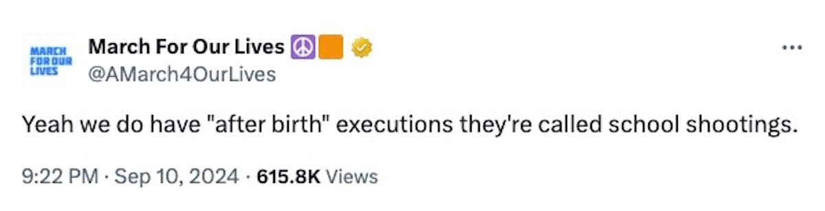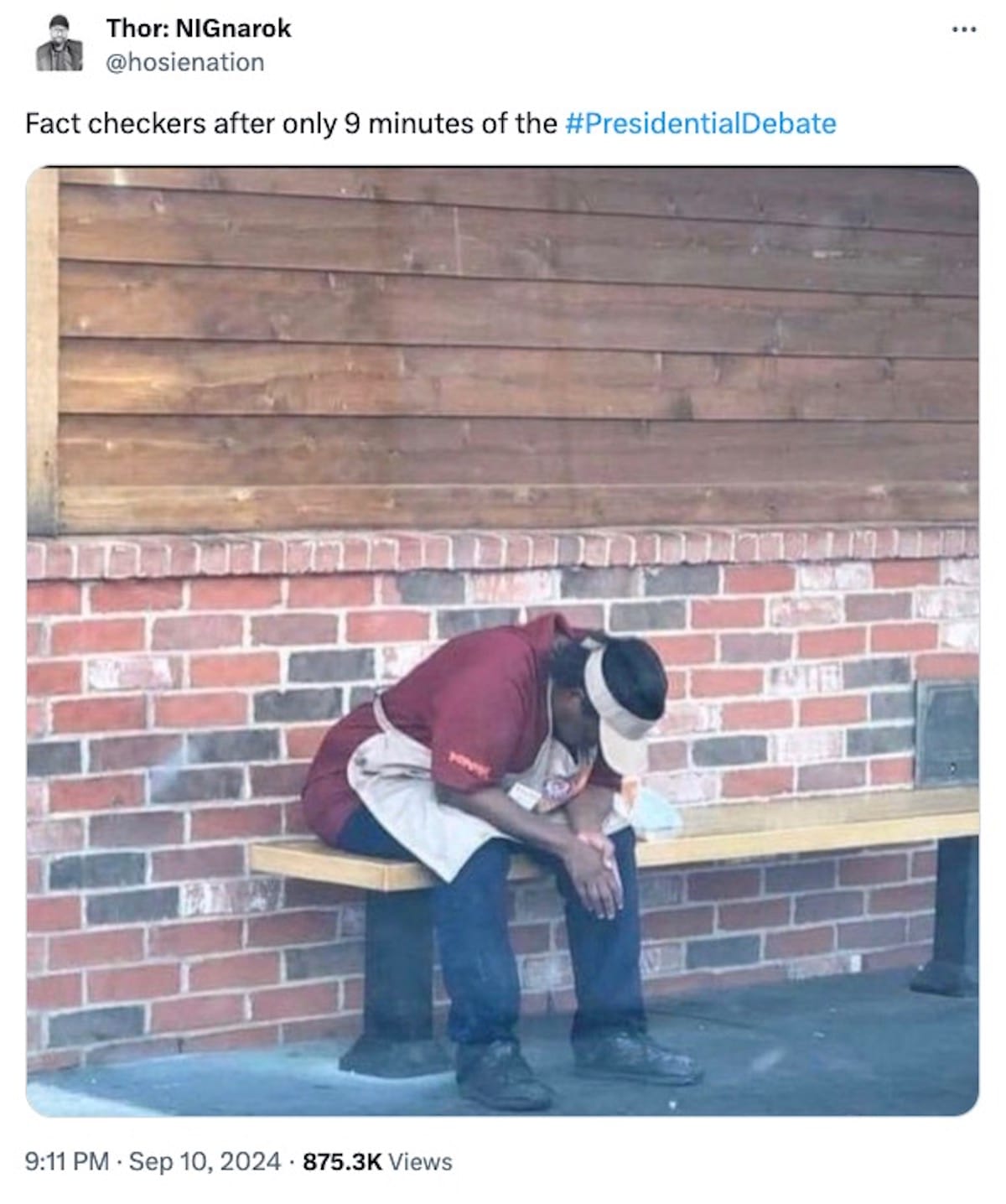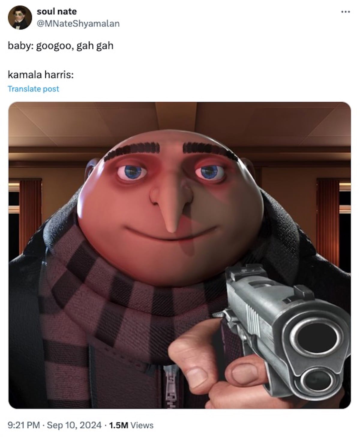 Of course, I can't meme the life out of this debate without nodding to Trump's incessant whining about "post-birth baby execution"s ... I mean, late-term abortions. Again, the debate moderators quickly set the record straight, informing Trump that not a single state allows for "termination" after birth. Harris on the other hand (per Trump's mind's eye, at least) ...